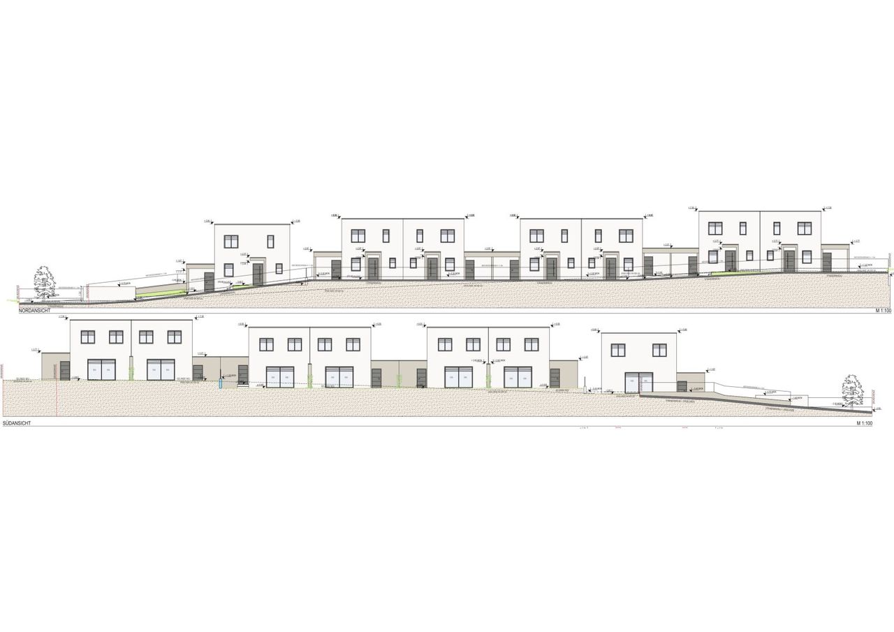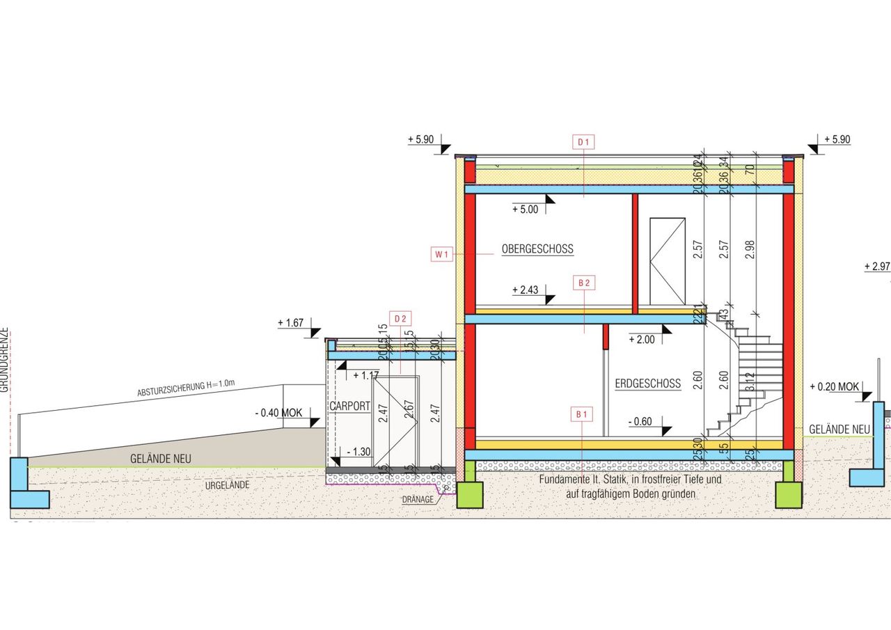 - Der Eingangsbereich, die Abtrennung zwischen den Terrassen, der Abstellraum beim Carport und das Carport werden in Beton ausgeführt.