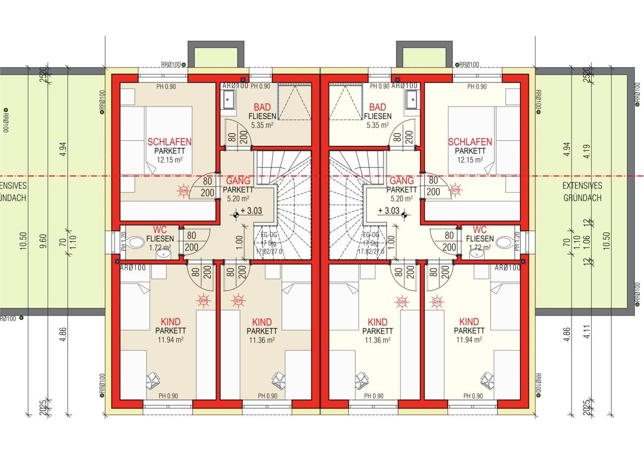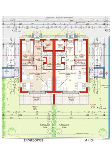 - Der Eingangsbereich, die Abtrennung zwischen den Terrassen, der Abstellraum beim Carport und das Carport werden in Beton ausgeführt.