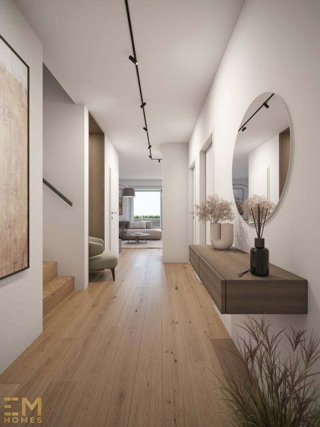 - Stiege: Die Trittstufe der Stiege wird mit dem gleichen Parkettboden belegt. Die Setzstufe wird weiß beschichtet.