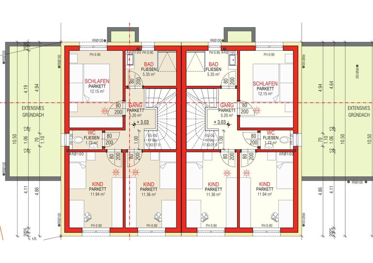 - Der Eingangsbereich, die Abtrennung zwischen den Terrassen, der Abstellraum beim Carport und das Carport werden in Beton ausgeführt.