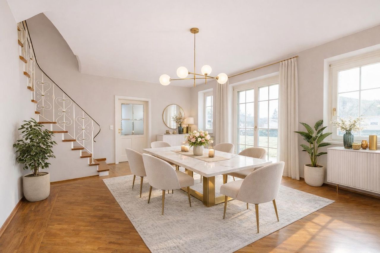 Bereits beim Betreten wird die Großzügigkeit des Hauses spürbar. Der offen gestaltete Wohn- und Essbereich bildet das Herzstück des Erdgeschosses und öffnet sich harmonisch zu den Außenflächen. Große Fensterflächen sorgen für eine helle, freundliche Atmosphäre und schaffen eine Verbindung zwischen Innen- und Außenraum.