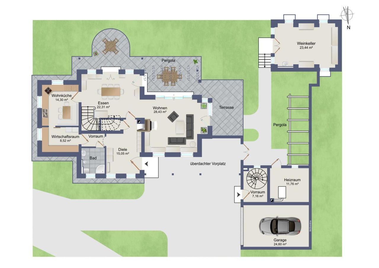 Ein weiteres Nebengebäude ergänzt das Ensemble. Im Erdgeschoss befinden sich die Garage sowie die Haustechnikräume.
