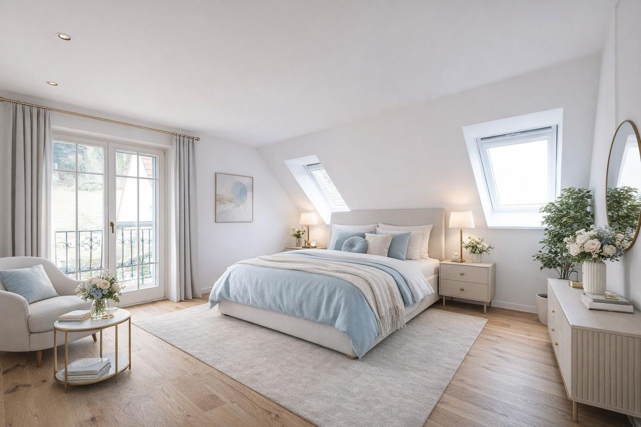 Im Obergeschoss befinden sich die privaten Rückzugsbereiche mit 2 großzügigen Schlafzimmern sowie weiteren Nebenräumen. Im großen Badezimmer befindet sich eine Sauna.