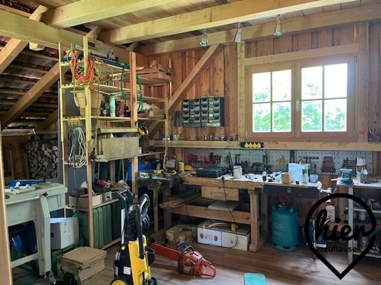 - Angeschlossen an das Haus ein wunderschöner Holzschuppen, ausgestattet als komplette Werkstatt und Holzlager