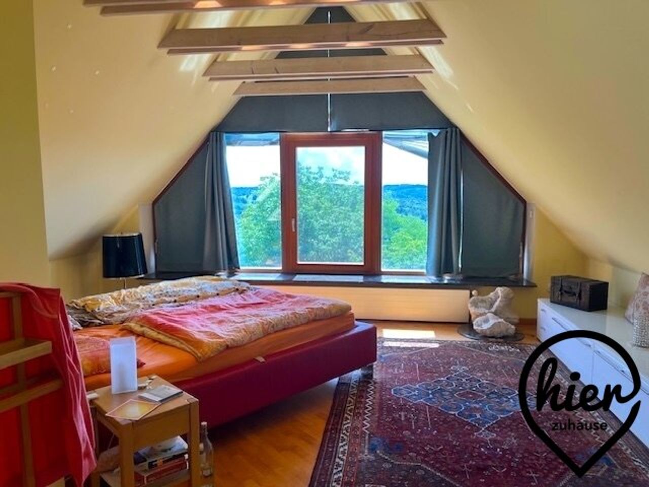 - Repräsentatives Master-Bedroom im OG mit atemberaubendem Blick über die Hügellandschaft der Südoststeiermark – direkt angeschlossen ein großzüges Ankleidezimmer und auch das Badezimmer mit Wanne – Holzbalken sorgen für Wärme
