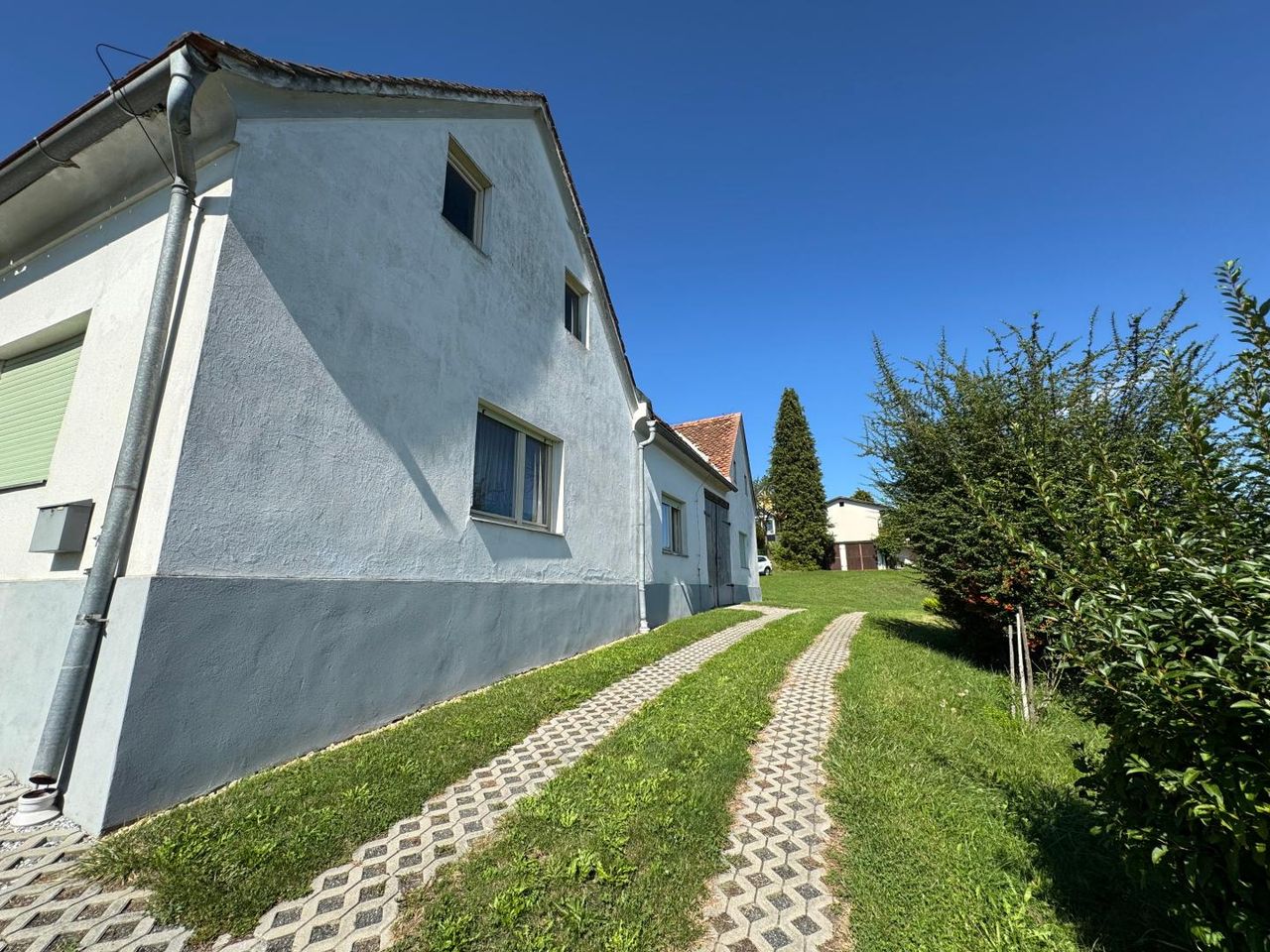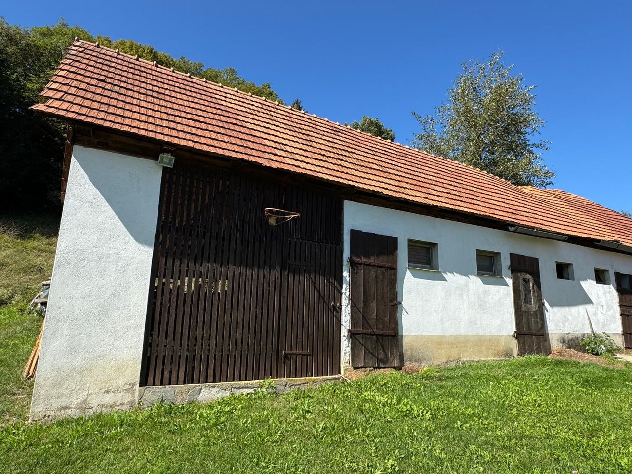 Weitläufige Wiesen und Obstbäume bieten perfekte Voraussetzungen für die Tierhaltung. Stallungen für große und kleine Tiere sind vorhanden.
