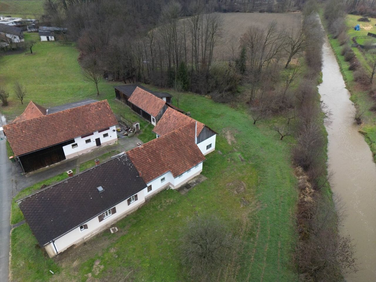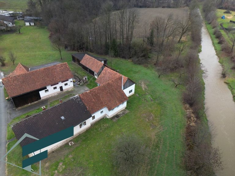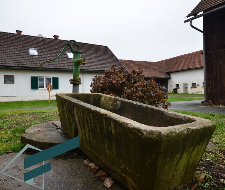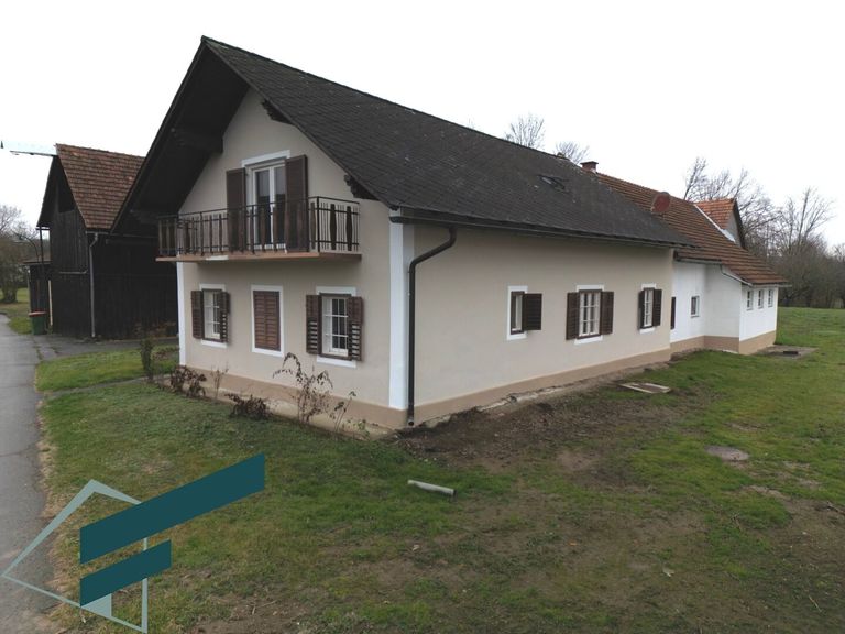 Eichfeld / Mureck - Wir dürfen hier eine Hofstelle ( inaktive Landwirtschaft ) auf knapp 1 ha Grund ( ca. 3100 m² davon BaulandDorfgebiet ) in Grünruhelage anbieten. Die Liegenschaft befindet sich am Ortsrand, angrenzend Felder und Wald, und bestehet aus dem Haupthaus, ehemaligen Stallungen, einer Scheune und einem großen Schuppen sowie einem weiteren Nebengebäude. Hierzu kommen noch 2 angrenzende Baugrundstücke mit je ca. 1030 m² , dies ergibt eine Gesamtgröße von ca. 11.404 m²