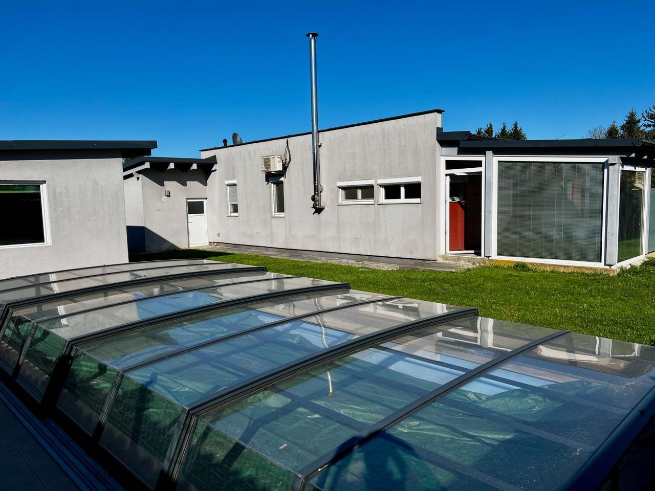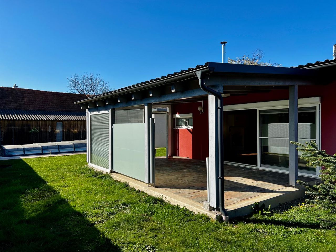 Das rund 800 m² große Grundstück ist liebevoll gestaltet und bietet ausreichend Platz für Erholung und Freizeit. Besonders hervorzuheben ist die großzügige, gepflasterte Terrasse, die überdacht ist und an zwei Seiten vollständig verglast wurde. Dadurch entsteht ein geschützter, ganzjährig nutzbarer Außenbereich mit hoher Wohnqualität. Der Pool sowie die Terrasse laden zum Entspannen ein und machen das Objekt zu einer echten Wohlfühloase.
