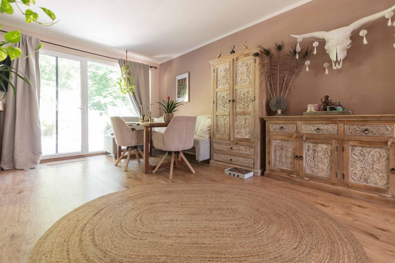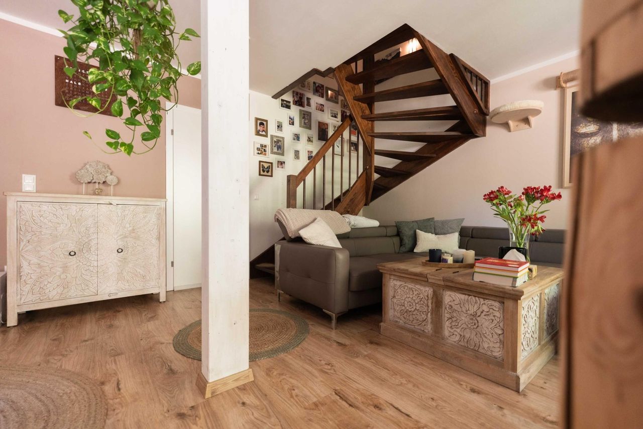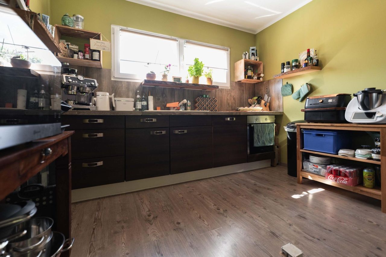 Schon beim Betreten empfängt einen ein angenehm gestalteter Eingangsbereich, der nahtlos in die lichtdurchflutete Wohnküche übergeht. Hier schafft die offene Gestaltung mit gemütlicher Essecke eine behagliche Atmosphäre, ideal für gemeinsame Stunden mit Familie und Freunden. Große Fensterflächen lassen viel Tageslicht herein und ermöglichen den direkten Zugang auf die Terrasse und in den Garten. Ein Rückzugsort voller Ruhe und Grün, mit gepflegtem Rasen und praktischer Gartenhütte.