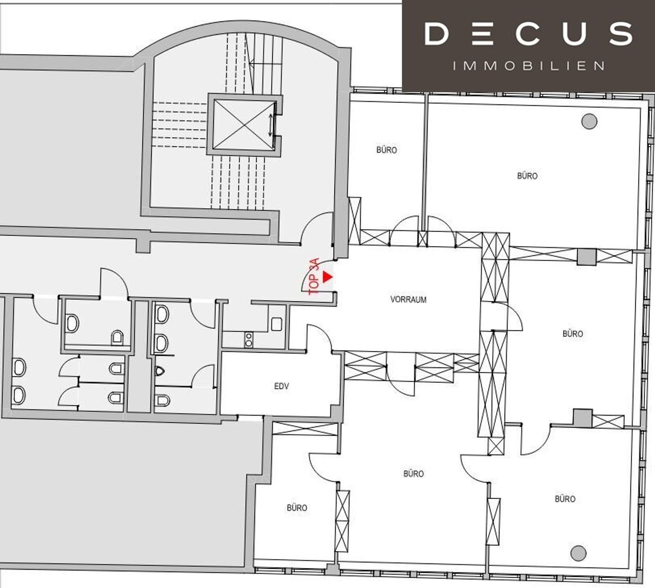 Die Büros im zeitlosen Design sind mit Raumkühlung ausgestattet und ab einer Größe von ca. 26 m² verfügbar (Kleinbüros 1 Raum, Sanitär am Gang).