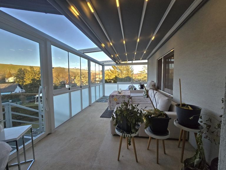 Wohnesszimmer 56,00 m² mit Zugang zur überdachten 22 m² Terrasse, welche sich elektrisch öffnen lässt. Weiters befindet sich ein Zugang/Treppe zum Garten.