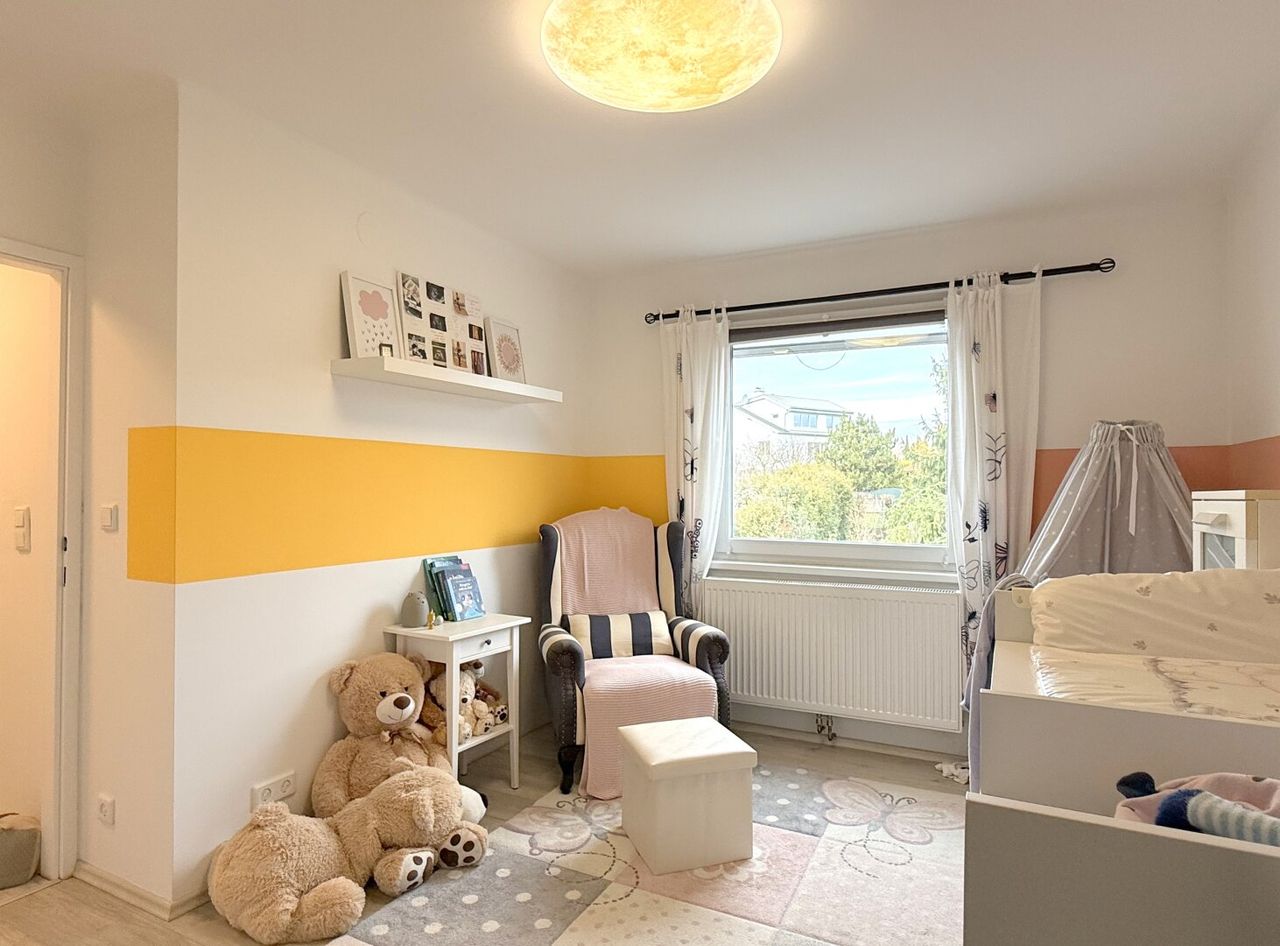 Auf der anderen Seite ein weiteres Zimmer, heute für die Kinder und morgen vielleicht etwas anderes, oder einfach genau das bleiben dürfen, was sie sind. Das Bad macht keine Versprechen, sondern begleitet den Alltag mit Badewanne und Dusche unaufgeregt und zuverlässig.