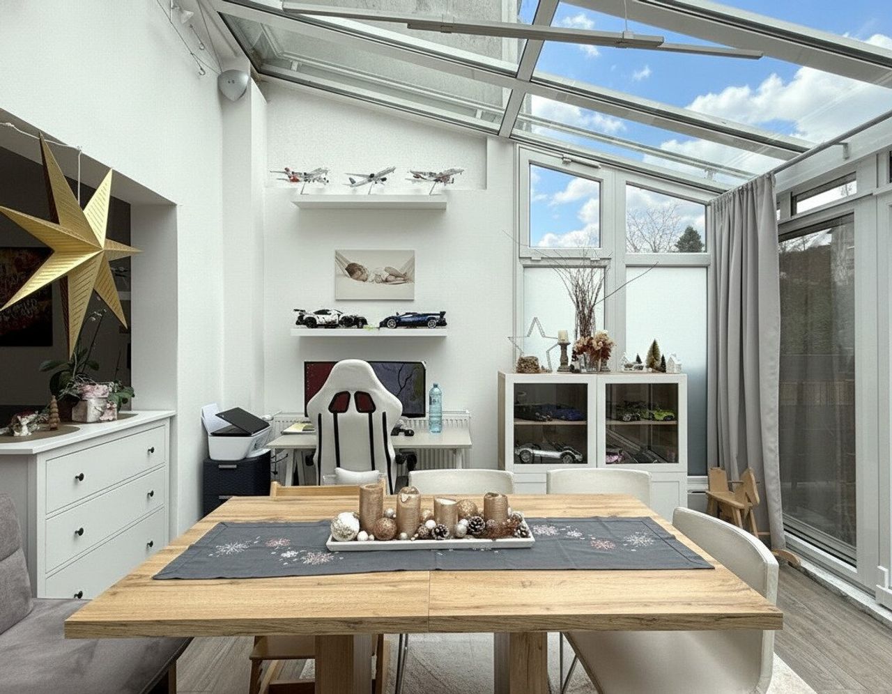 Oben angelangt, öffnet sich das Wohnzimmer ohne sich aufzudrängen, hell, ruhig, mit diesem Licht, das nichts inszeniert und trotzdem alles gut aussehen lässt. Der Schwedenofen steht da wie jemand, der selten spricht, aber immer Recht hat und man weiß sofort, dass Abende hier anders enden als geplant. Der angrenzende Wintergarten verspricht einen erweiterten Wohnraum und schiebt sich ganz selbstverständlich dazu, nicht als Extra, sondern als Verlängerung des Alltags, viel Glas, viel Himmel, ein Raum, der nicht weiß, ob er Essplatz, Spielplatz oder Denkpause ist – und genau deshalb alles zugleich sein darf. Hier bleibt man sitzen, auch wenn man eigentlich schon aufstehen wollte, hier verlieren Gespräche ihren Anfang und ihr Ende, und manchmal vergisst man, ob man drinnen oder draußen ist, was im Grunde eine sehr angenehme Verwirrung ist.
