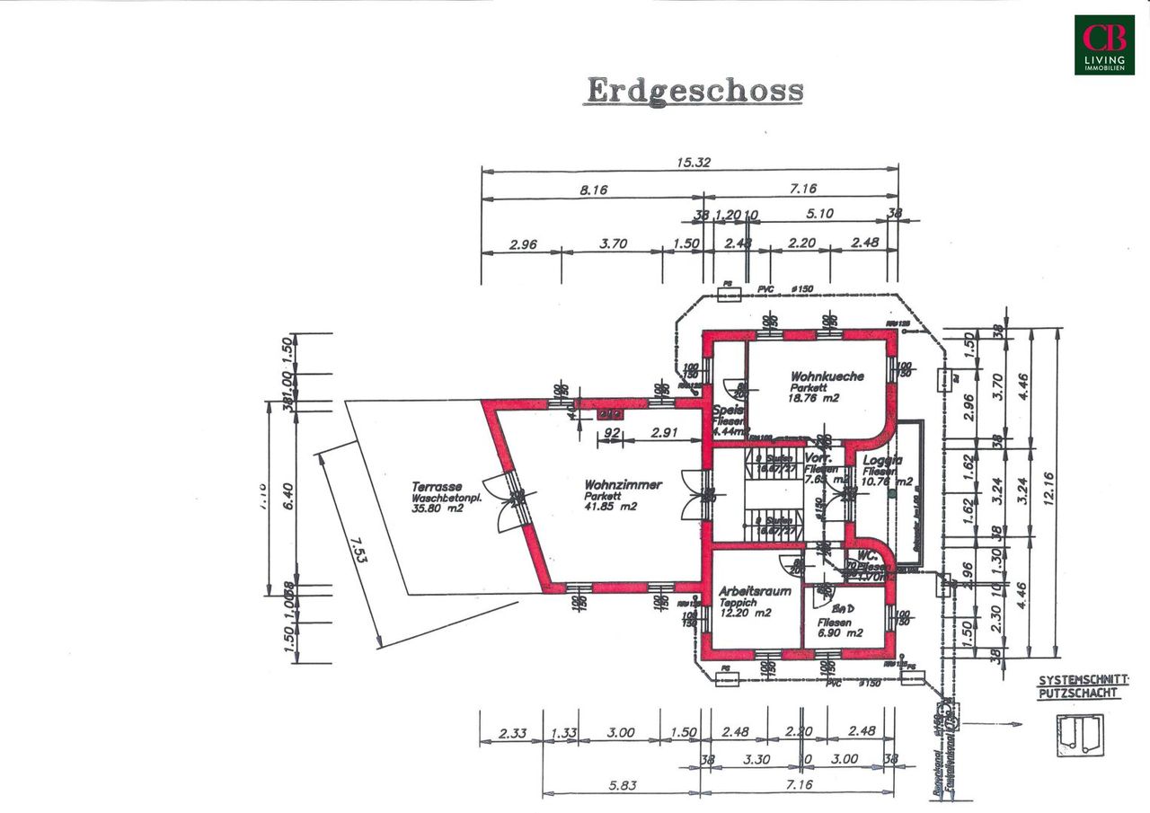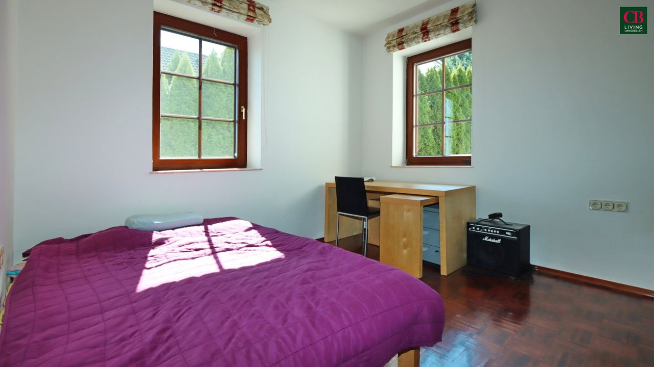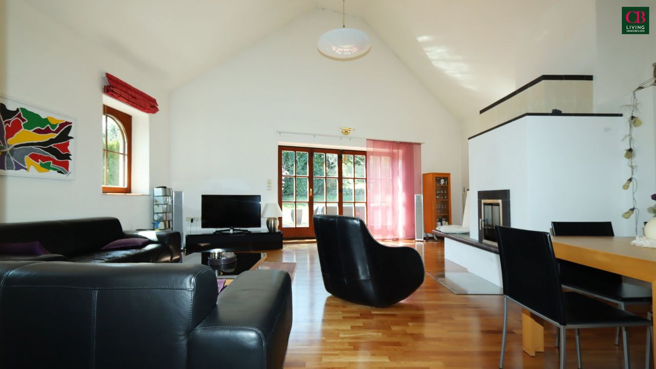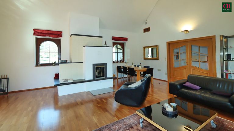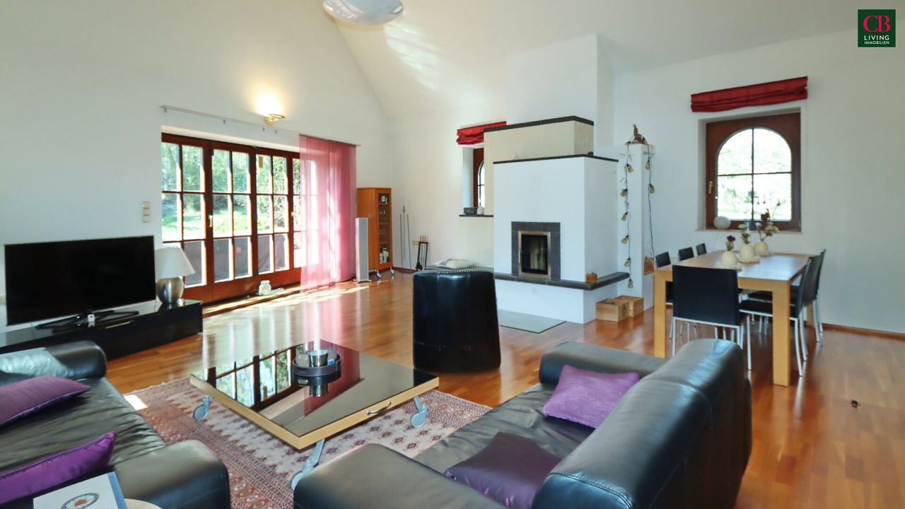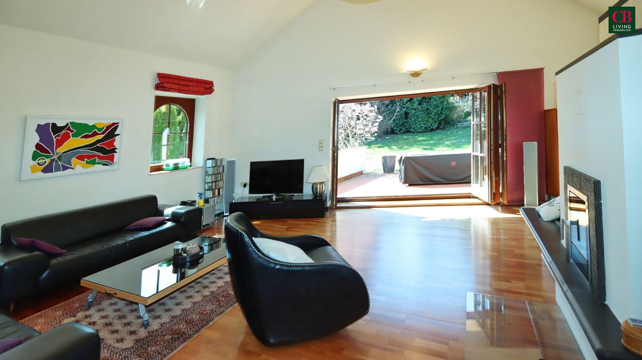 Das Highlight dieser Villa ist der einzigartige Wohnsalon mit seiner Raumhöhe von fast 5 Metern und einem edlen Kachelofen und Ausgang in den Südgarten!