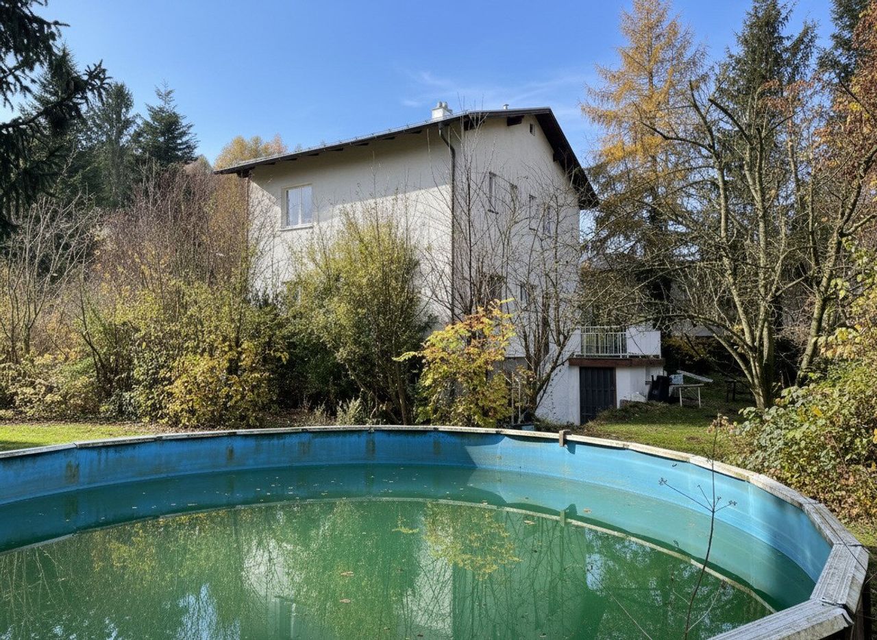 Das 952 m² große Grundstück zeigt sich nicht geschniegelt, sondern wildromantisch. Der Garten darf wachsen, sich entfalten und ein bisschen seinen eigenen Kopf haben. Er grenzt an ein kleines Bächlein und bietet viel Platz für alle, die Natur lieber lebendig als perfekt gestutzt mögen. Ein Pool und ein Gewächshaus sind vorhanden – Zeichen dafür, dass hier immer schon gern draußen gelebt wurde.