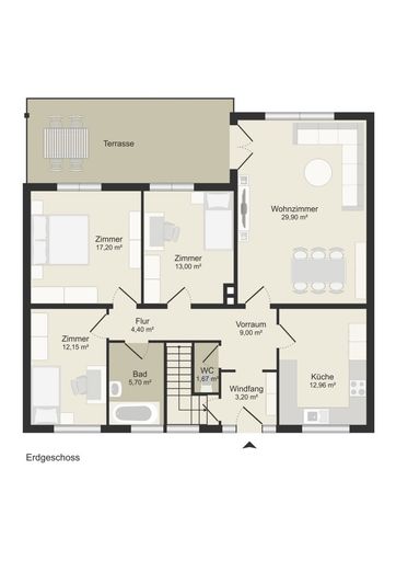 Die Wohnfläche beträgt ca. 109 Quadratmeter und umfasst vier Zimmer in einem praktischen, familienfreundlichen Grundriss mit einem Wohnzimmer, einer Küche, einem Bad, einem WC und drei Schlafzimmern. Die sonnige Terrasse eignet sich ideal für Frühstück im Freien oder den Genuss von...