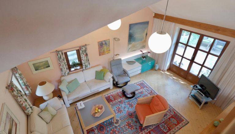 • Einladender Wohnbereich mit Galerie und Ausblick ins Grüne