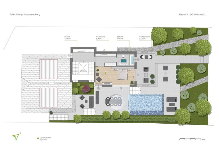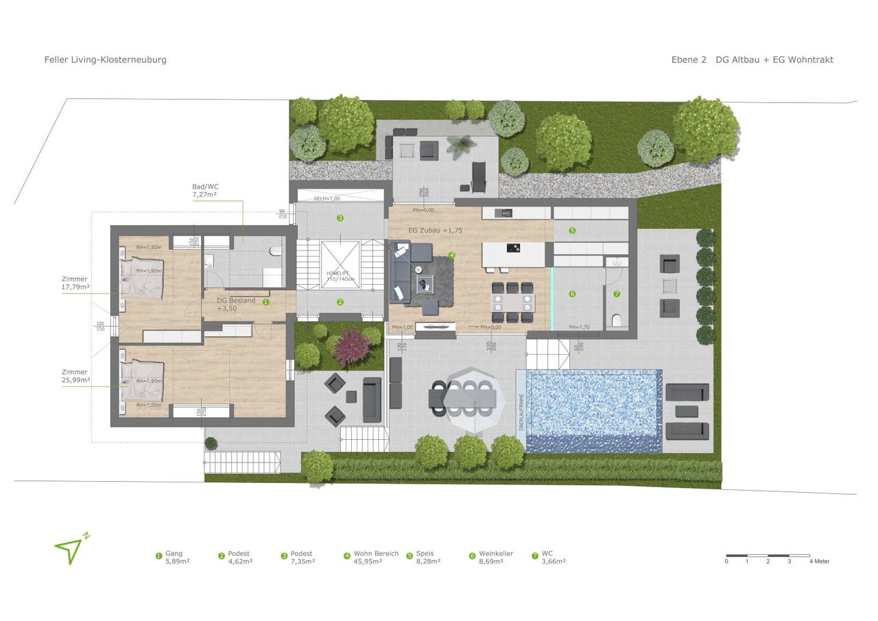 Wie Sie den Grundriss Darstellungen entnehmen können, bietet FELLER LIVING in der Endausbaustufe ein absolut großzügiges und vor allem flexibel gestaltbares Raumangebot (separat begehbare Einliegerwohnung oder Büro, Kinderebene oder großzügiger Wellness / Fitnessbereich, Wohnbereich mit oder ohne Wein-Lounge, etc.) und zahlreiche optionale Leistungen für den Außenbereich (Poolanlage, Gartengestaltung, Saunahaus,..). Je nach Wunsch kann der Kunde aus einer Vielzahl an Ausbaustufen wählen.
