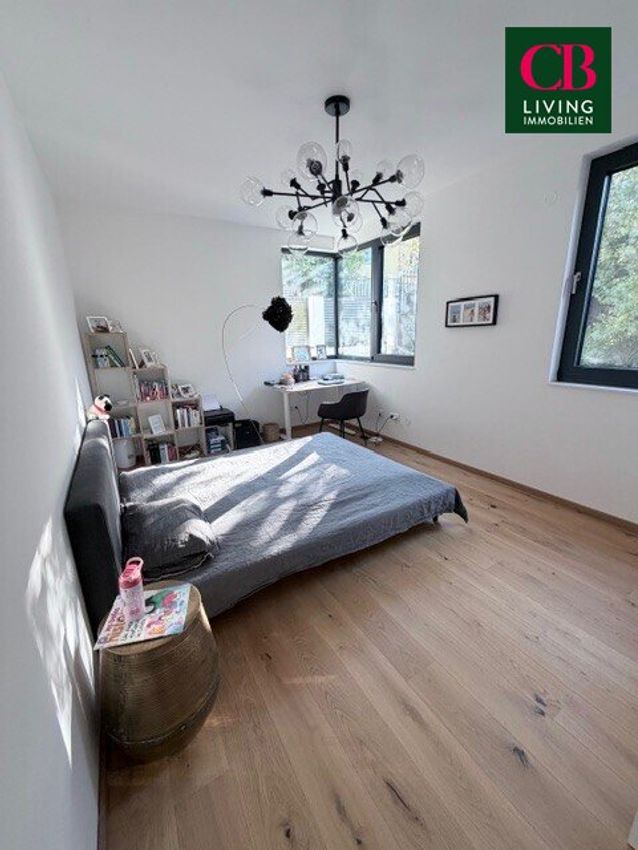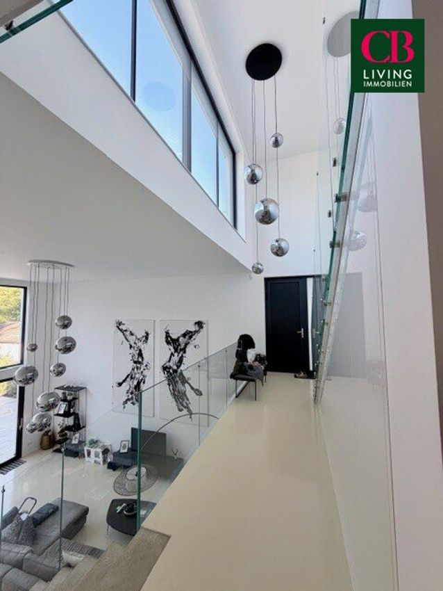 Bereits beim Betreten eröffnet sich ein spektakulärer Wohnraum mit doppelter Raumhöhe, Galerieebene und imposanter Glasfront. Die offene Gestaltung schafft ein einzigartiges Wohngefühl aus Transparenz, Freiheit und Design.