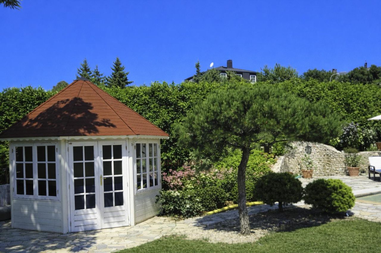 2.000m2 mit ebenem Rasen, div. Bäumen, Sträuchern und Blumenbeeten, Böschung mit verschiedenen Pflanzen, Whirlpool, Grillplatz mit Bar und Kühlschrank, möblierter Pavillon, 8x4m Swimming-Pool-vollautomatische Reinigung und Desinfizierung, Steindusche, Liegebereich, Spielplatz mit Rutsche und Schaukel, beheizte Garageneinfahrt und Eingangsbereich, vollautomatische Bewässerung, Automatischer Rasenmäher, Abendbeleuchtung im Garten;