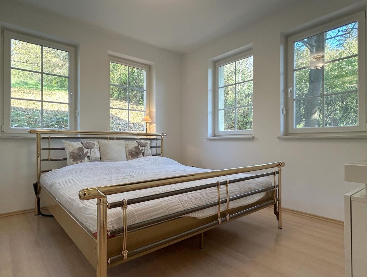 Eine zweite Tür verbindet das Badezimmer mit einem weiteren, südseitig ausgerichteten Zimmer, das zudem Zugang zum westseitigen Balkon bietet.