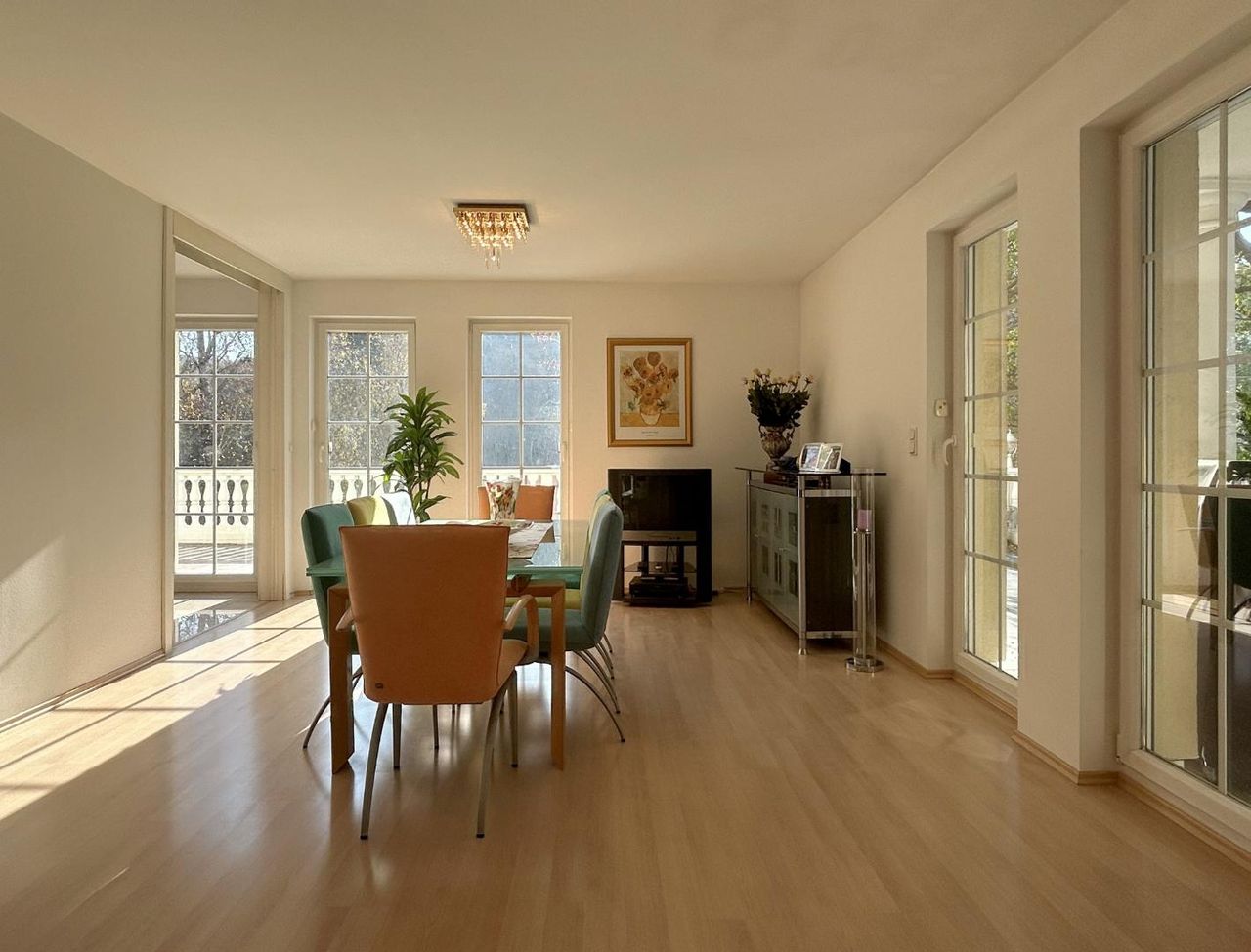 Sechs Terrassentüren öffnen sich zum Außenbereich, vier davon überdacht und somit auch bei leichtem Regen bestens nutzbar. Von hier aus genießen Sie einen traumhaften Blick in Ihren eigenen Park mit majestätischem, alt-ehrwürdigem Baumbestand – jeder Baum ein stiller Geschichtenerzähler.