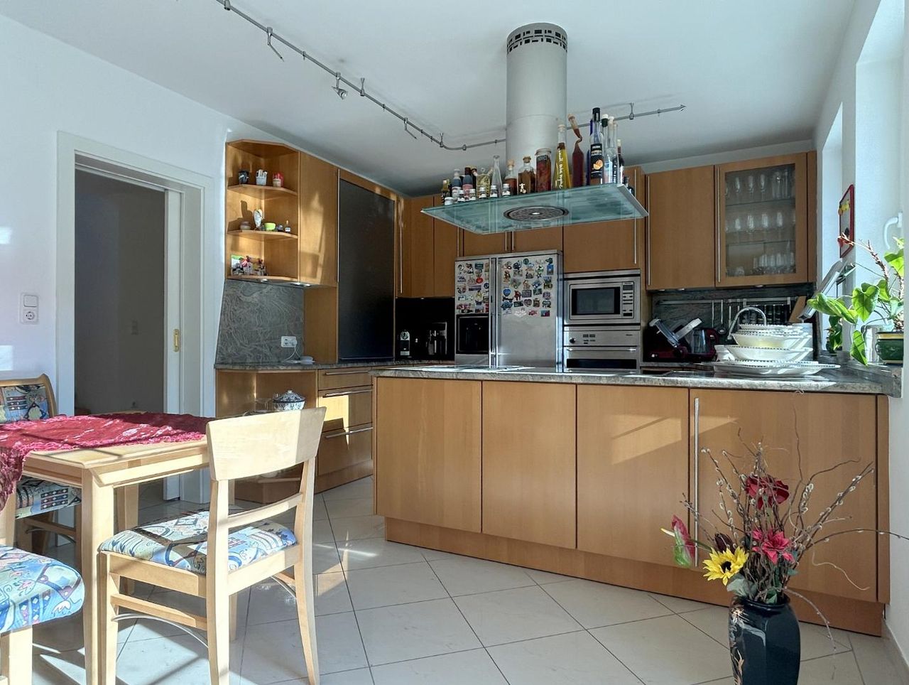 Der Diele entlang, stets mit Blick auf den Wohnsalon, führt der Weg links in die Küche. Kompakt, aber bestens ausgestattet, bietet sie zudem eine gemütliche Sitzecke für den kleinen Hunger zwischendurch. Zwei Fenster sorgen für viel Licht und eine direkte Verbindung zur großartigen Terrasse schafft Raum für den Side-Step nach draußen.