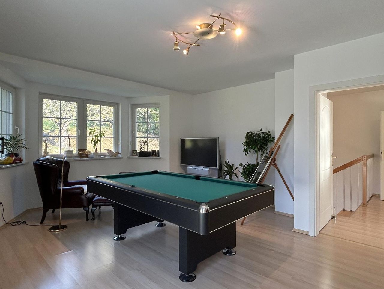 Das dritte Zimmer auf dieser Etage verfügt ebenfalls über eine gemütliche Erkerecke und wird derzeit als stilvolles Herrenzimmer genutzt. Mit dem direkten Ausgang auf den Balkon genießen Sie einen guten Überblick über Ihre Liegenschaft. Ein perfekter Rückzugsort mit elegantem Flair.