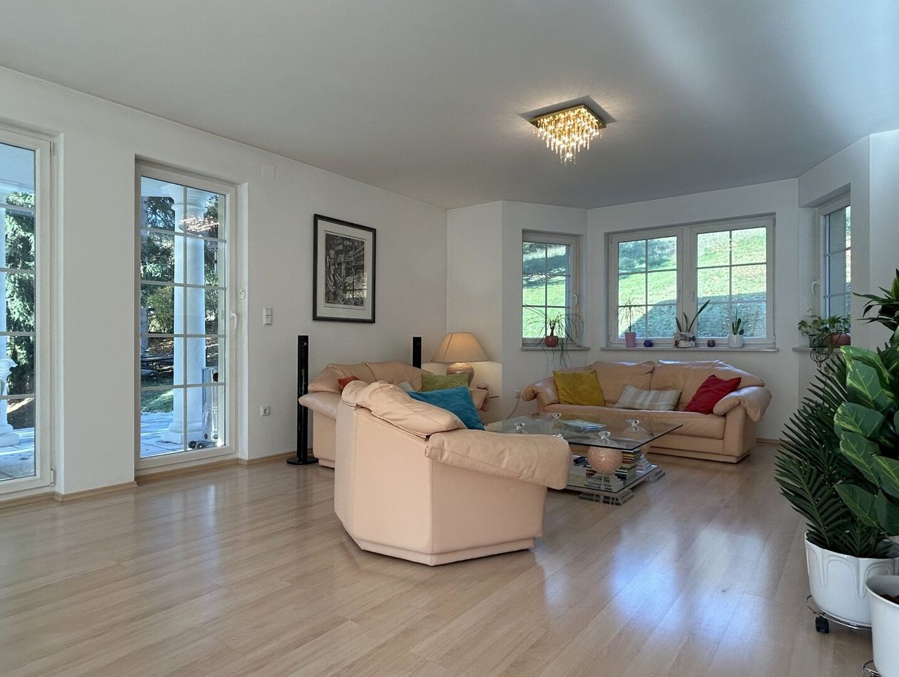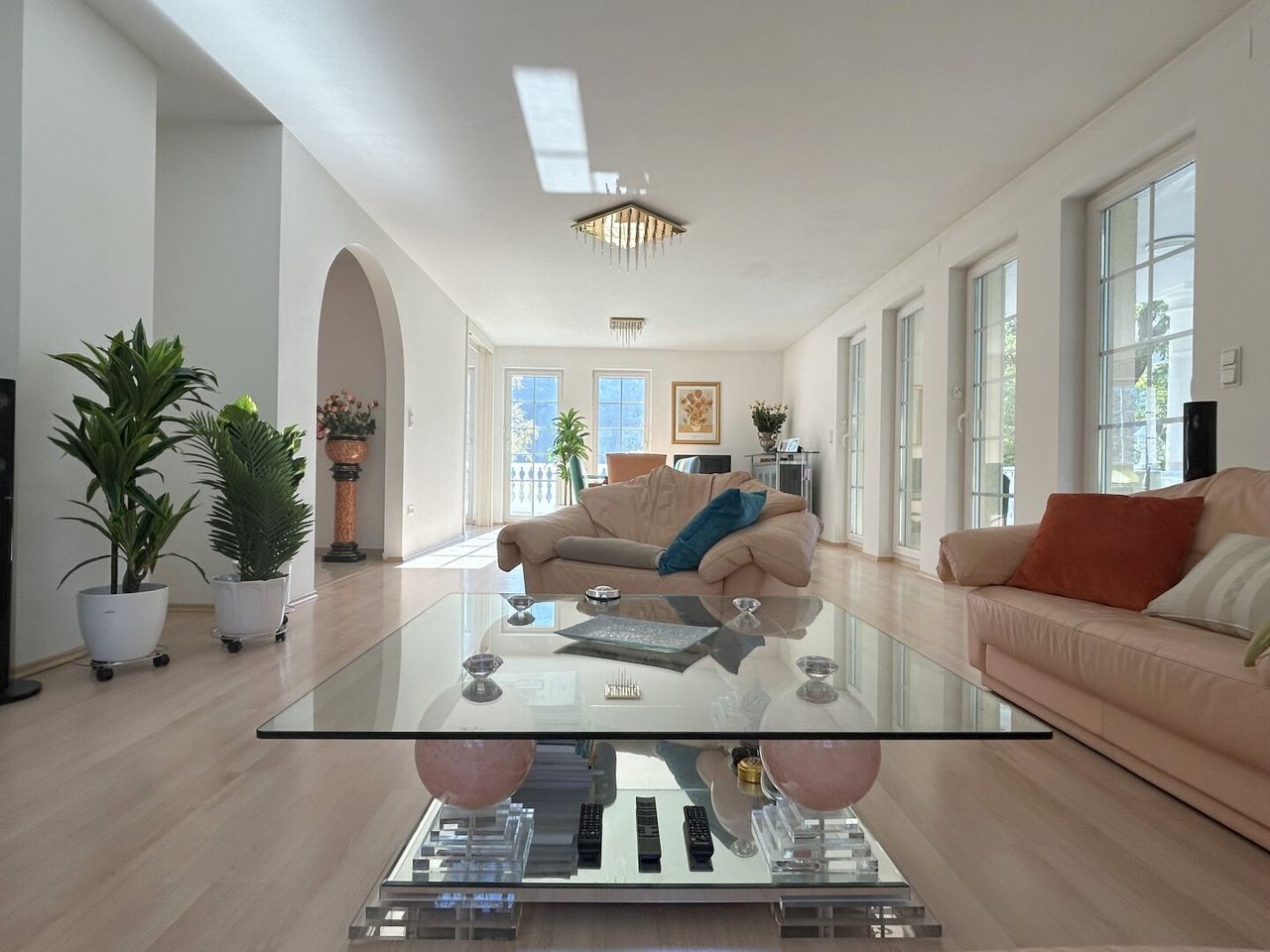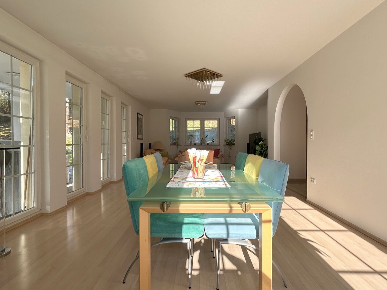 Sechs Terrassentüren öffnen sich zum Außenbereich, vier davon überdacht und somit auch bei leichtem Regen bestens nutzbar. Von hier aus genießen Sie einen traumhaften Blick in Ihren eigenen Park mit majestätischem, alt-ehrwürdigem Baumbestand – jeder Baum ein stiller Geschichtenerzähler.