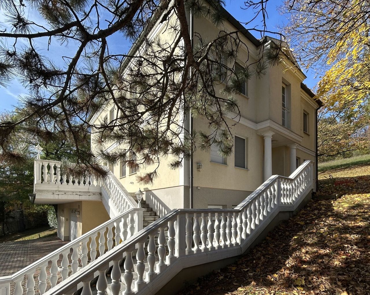 Das Haus selbst erweckt den Eindruck eines prachtvollen Landsitzes für Adelige, mit seiner großzügigen Terrasse, den eleganten weißen Steingeländern, der imposanten Treppe und dem insgesamt majestätischen Erscheinungsbild. Umgeben von nahezu 7.000 m² Grund, ohne sichtbare Nachbarn, lebt man hier gefühlt in völliger Abgeschiedenheit, fernab von Trubel und dem gewohnten Alltag.