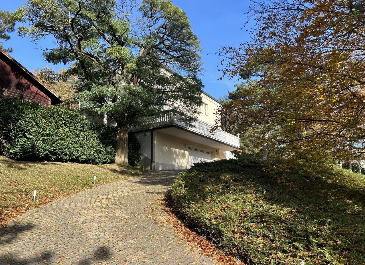 Eine elegante Auffahrt führt Sie durch einen parkähnlichen Vorgarten, bis Sie das Haus erreichen. Ein großer Parkplatz, selbst eine Stretch Limousine könnte hier mühelos wenden.