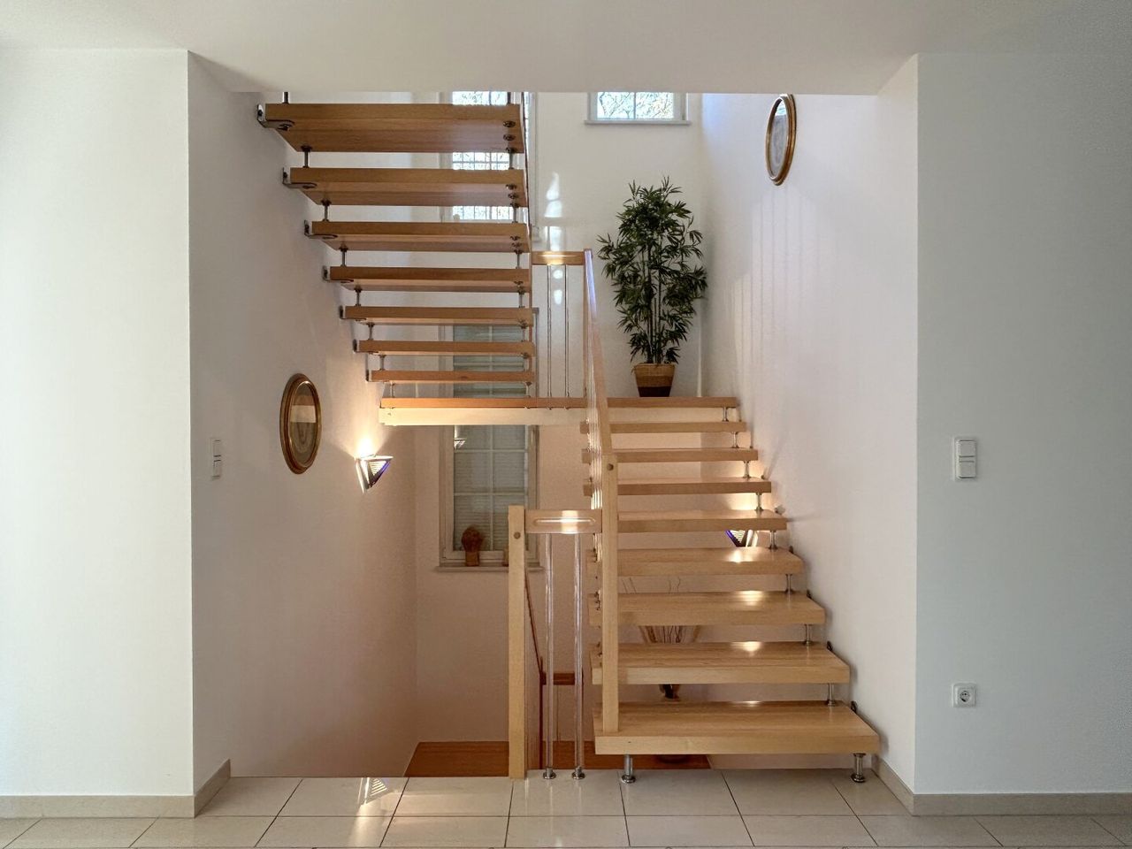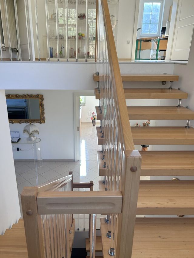 Zurück im Haus führt der Weg hinauf über die außergewöhnliche Kenngott-Holztreppe, kunstvoll gestaltet mit eleganten Glassprossen.