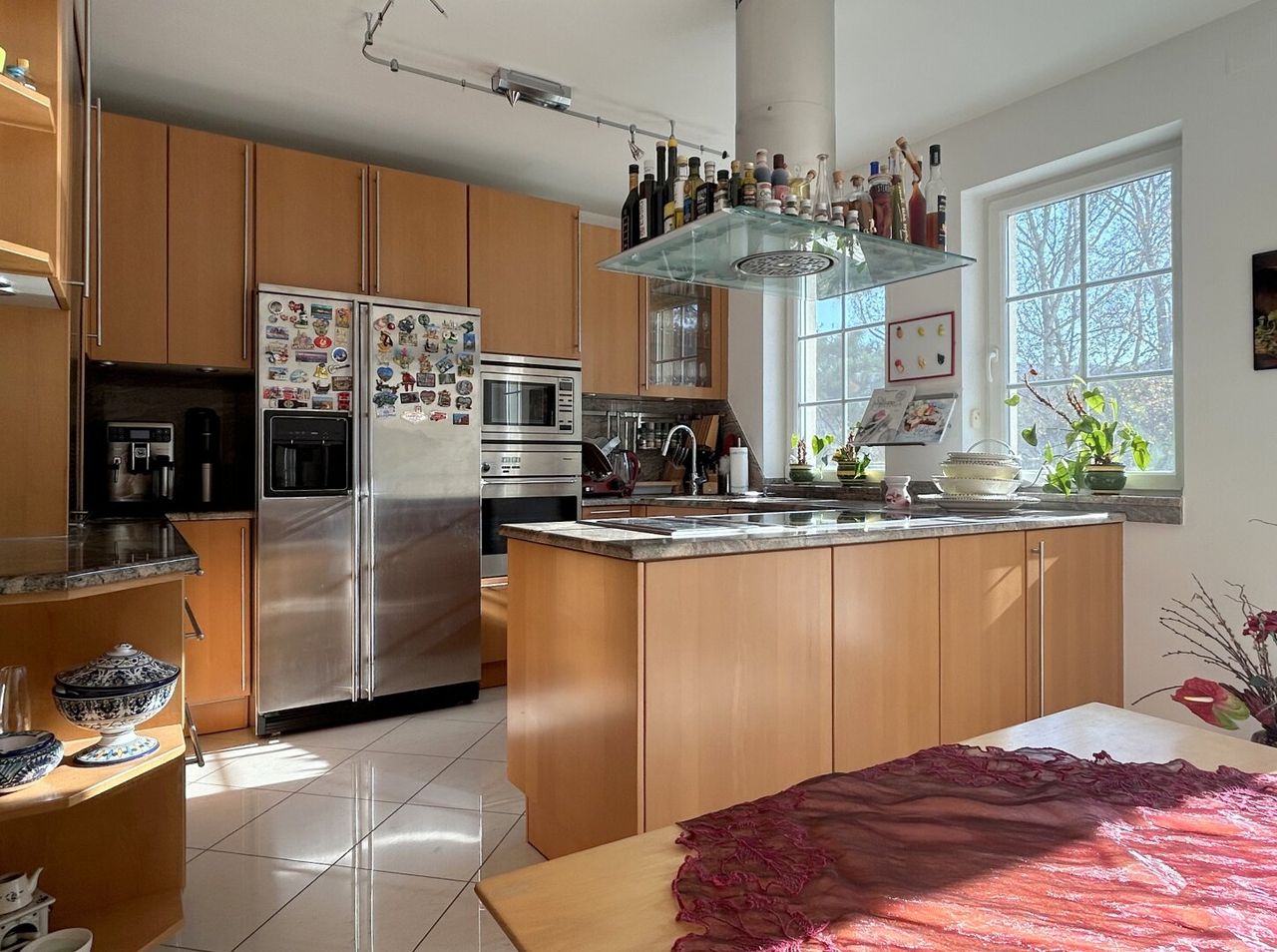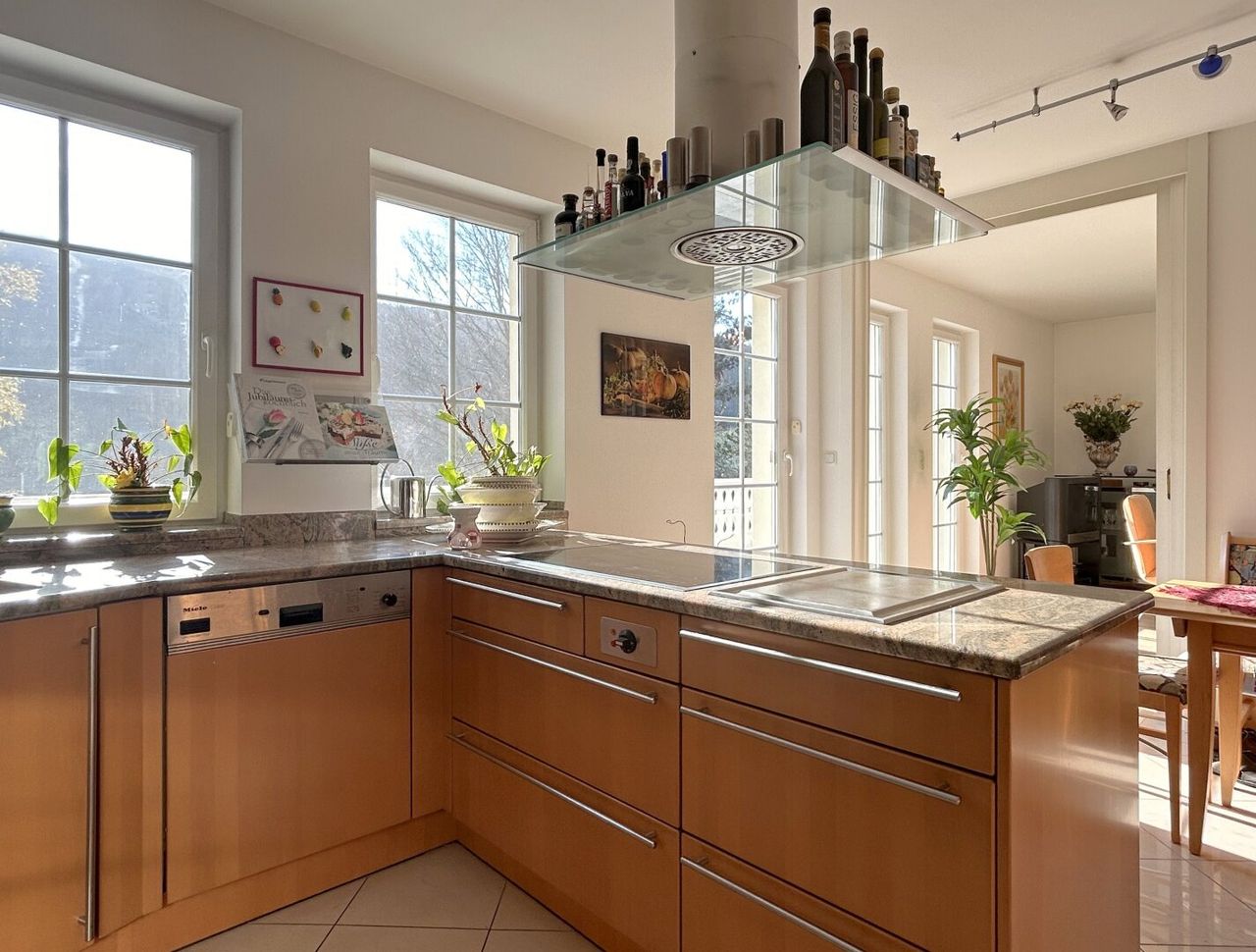 Der Diele entlang, stets mit Blick auf den Wohnsalon, führt der Weg links in die Küche. Kompakt, aber bestens ausgestattet, bietet sie zudem eine gemütliche Sitzecke für den kleinen Hunger zwischendurch. Zwei Fenster sorgen für viel Licht und eine direkte Verbindung zur großartigen Terrasse schafft Raum für den Side-Step nach draußen.