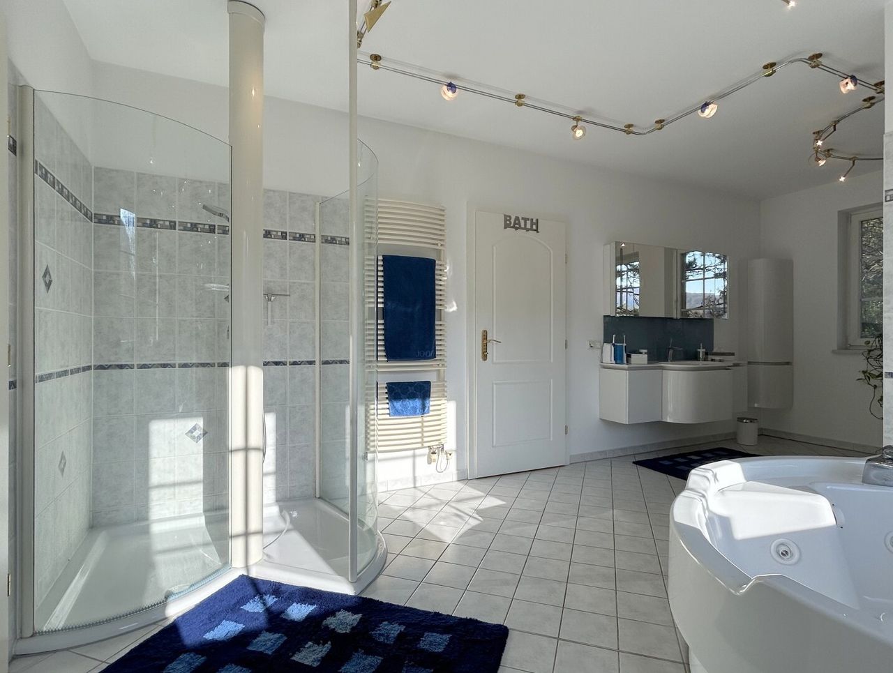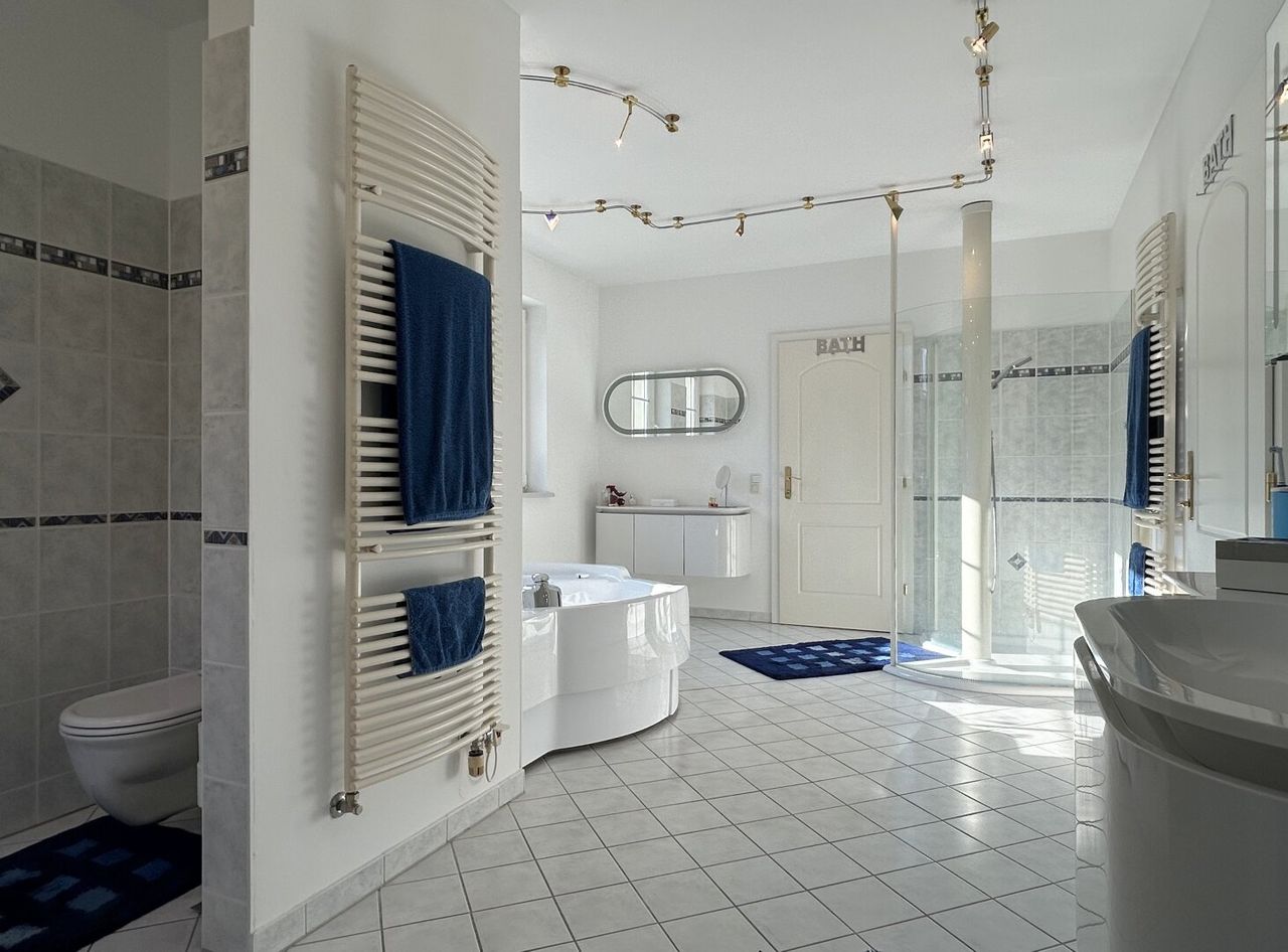 Hier von einem Badezimmer zu sprechen, wäre eine glatte Untertreibung. Auf ca. 22 m² genießen Sie höchsten Komfort: ein Whirlpool für entspannte Stunden, eine geräumige Walk-in-Dusche in Schneckenform für erfrischende Momente und eine perfekte Aufteilung mit Waschtisch, Schminktisch und WC. Vier Fenster sorgen nicht nur für reichlich Tageslicht, sondern auch für ein stets angenehmes Raumklima – Frische und Wohlgefühl gibt es hier frei Haus.