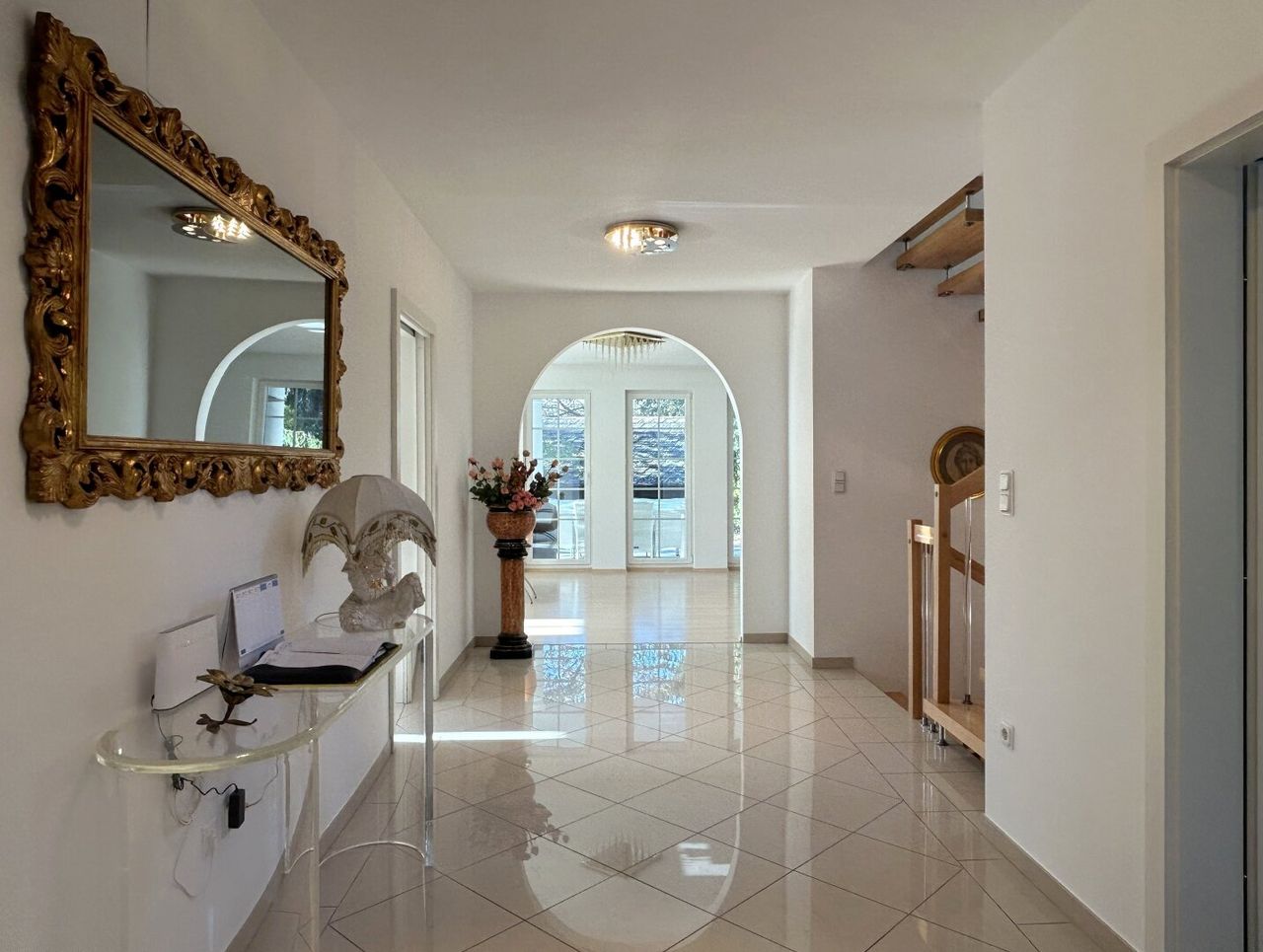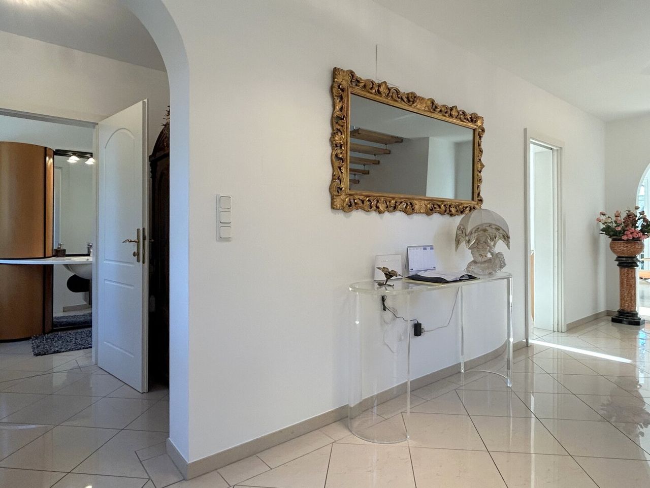 Kaum eingetreten, lassen die großzügigen Dimensionen sofort die Erwartungen steigen. Die weitläufige Diele in strahlendem Weiß lenkt den Blick unweigerlich auf das Herz des Hauses – den eleganten Wohnsalon. Doch bevor wir uns diesem Bereich widmen, nehmen wir zunächst die anderen Räumlichkeiten in Augenschein.