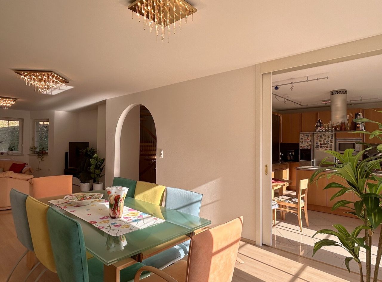 Endlich im Wohnsalon angekommen, wird dieser all Ihre Vorstellungen von Raum und Zeit übertreffen. Mit ca. 53 m² bietet er den perfekten Rahmen, um Ihrer Familie großzügigen Freiraum und höchsten Komfort zu schenken. Ein imposanter Esstisch, ideal für unvergessliche Abende im Kreise Ihrer Liebsten, thront zentral im Raum – großzügig und dennoch harmonisch platziert. Die Wohnlandschaft fügt sich elegant in einen angedeuteten Erker ein und schafft so eine gemütliche Rückzugsecke.