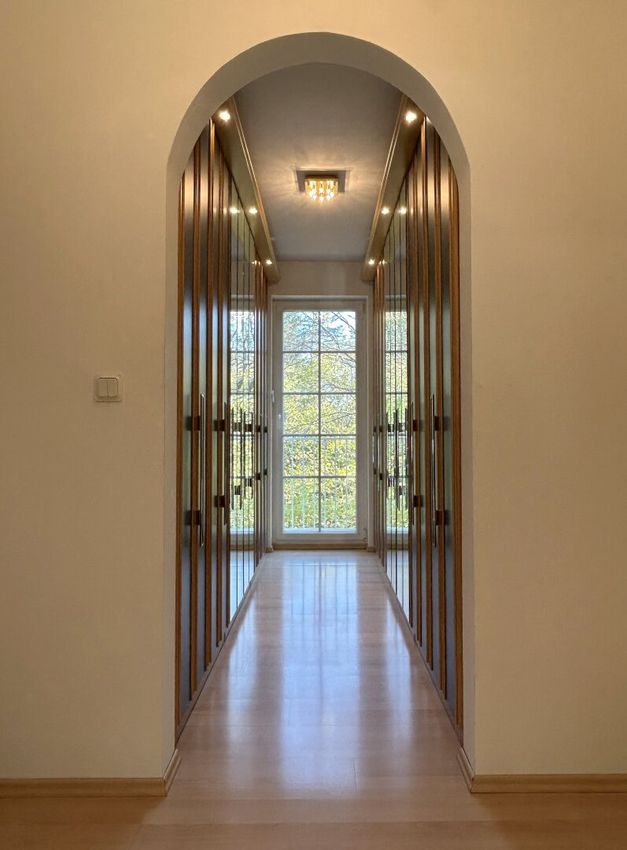 Rechts vom Eingang befindet sich ein charmantes Gästezimmer, vis-à-vis die stilvolle Garderobe und angrenzend die geschmackvolle Gästetoilette.