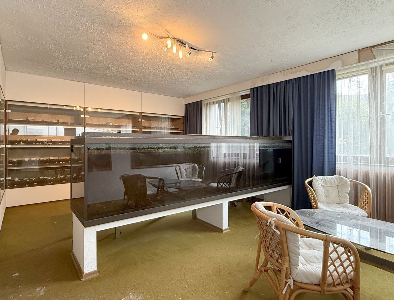 Ebenfalls im Untergeschoss, auch zur Vorderseite, befindet sich ein weiteres, sehr großes Zimmer – mit einer Nutzung, die man so nicht alle Tage sieht. Der Eigentümer hat sich hier seiner Leidenschaft gewidmet und ein kleines, sehr persönliches „Steinmuseum“ eingerichtet, ergänzt durch mehrere Aquarien, von denen eines bis heute geblieben ist.