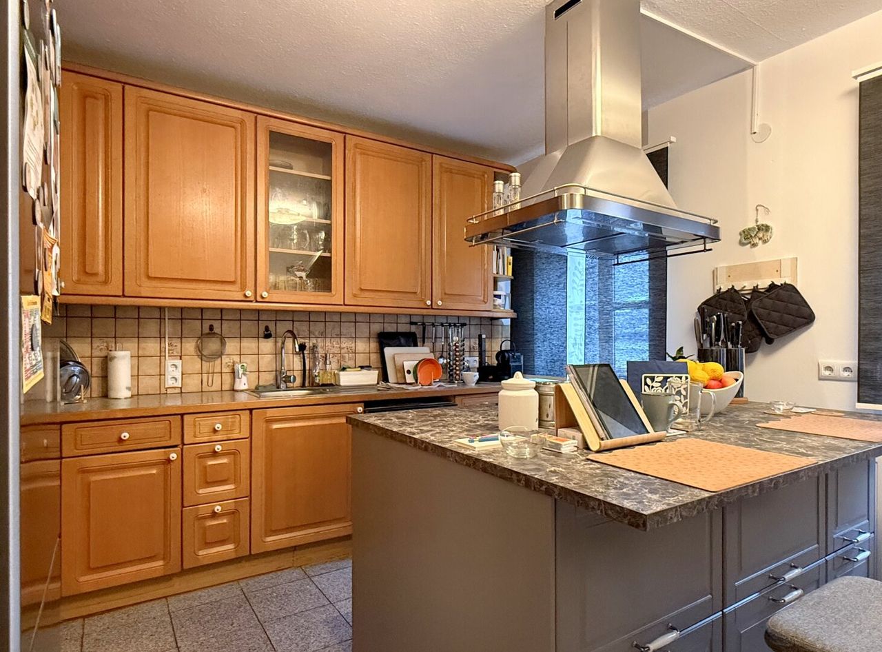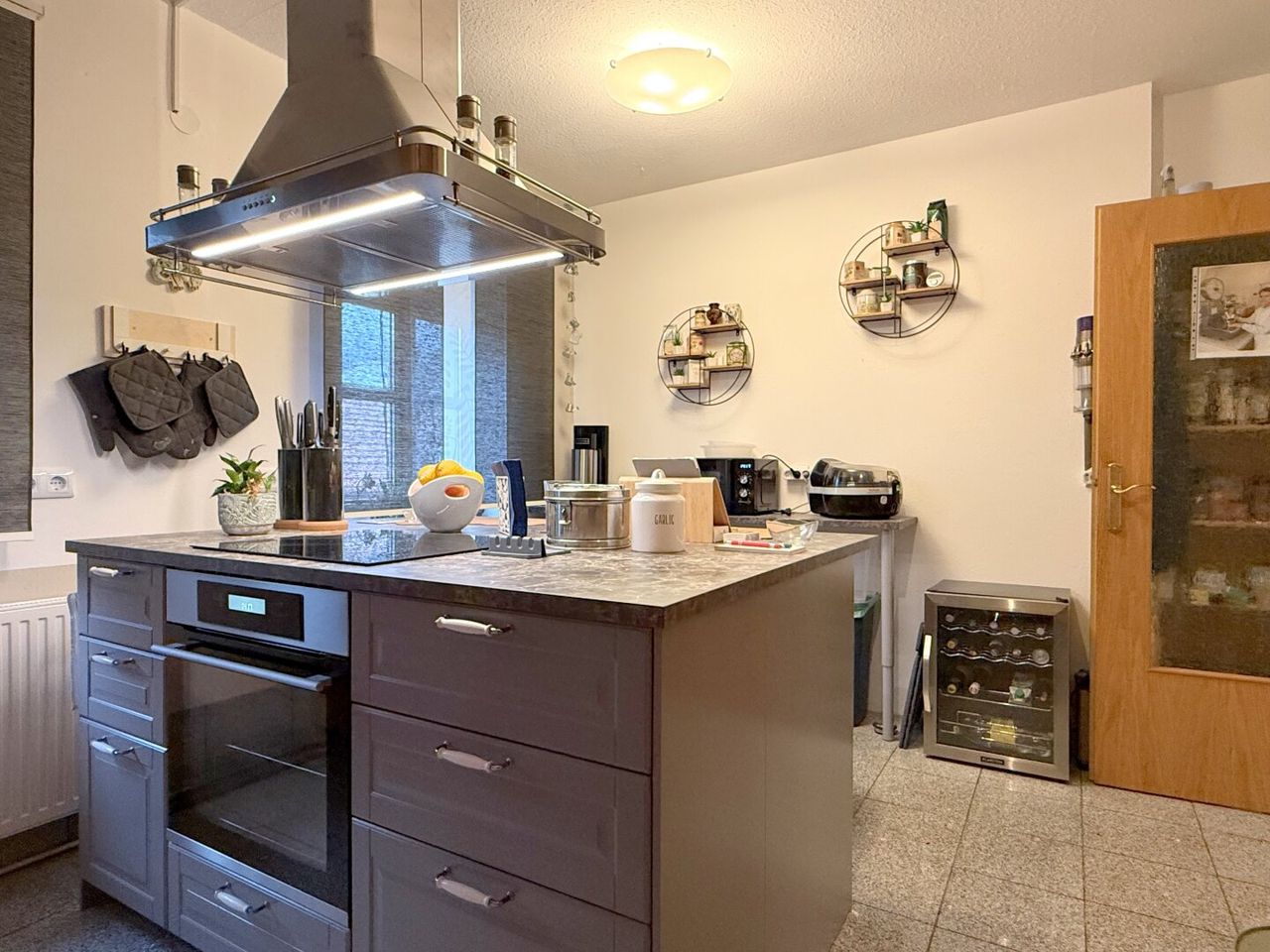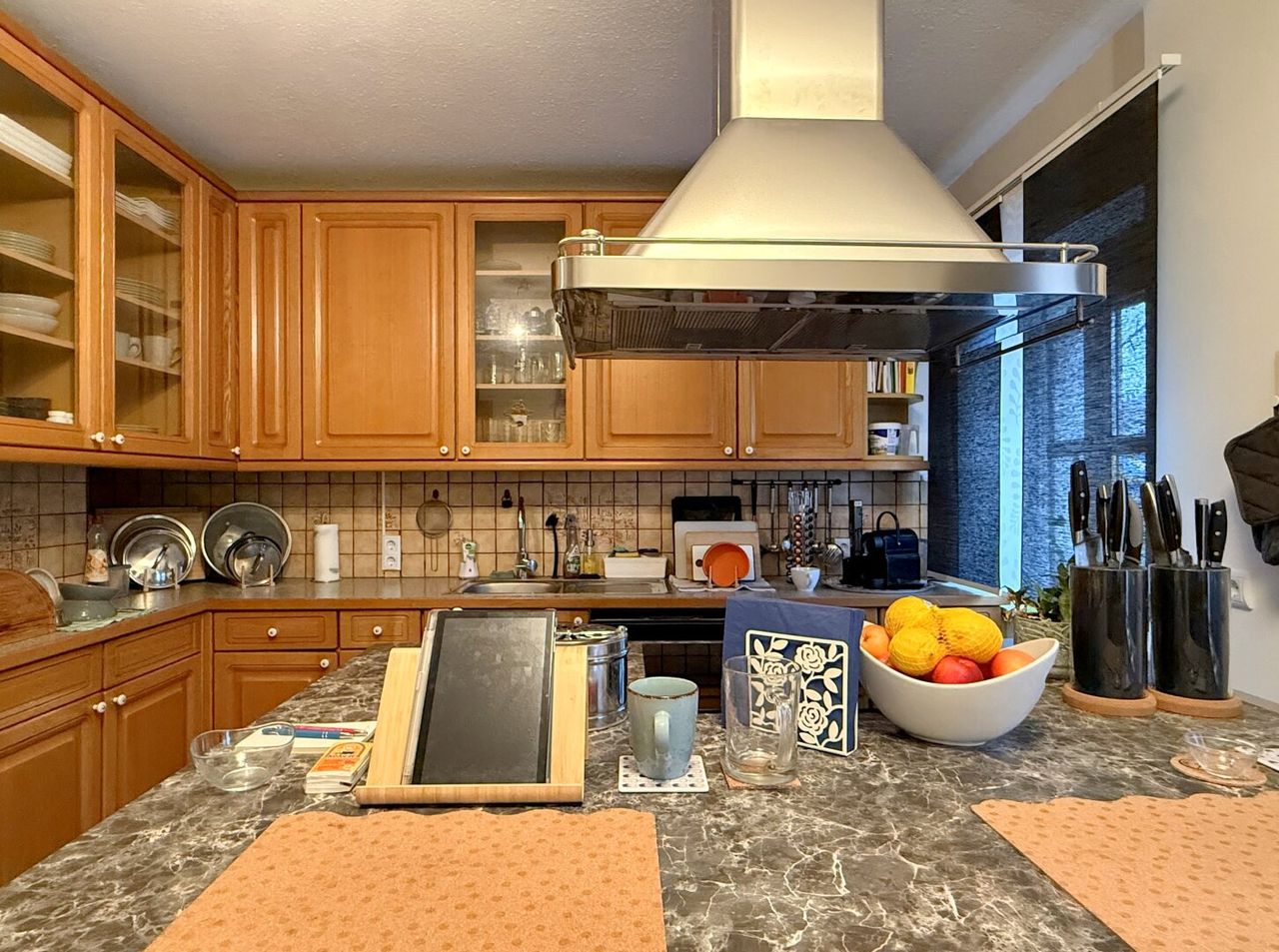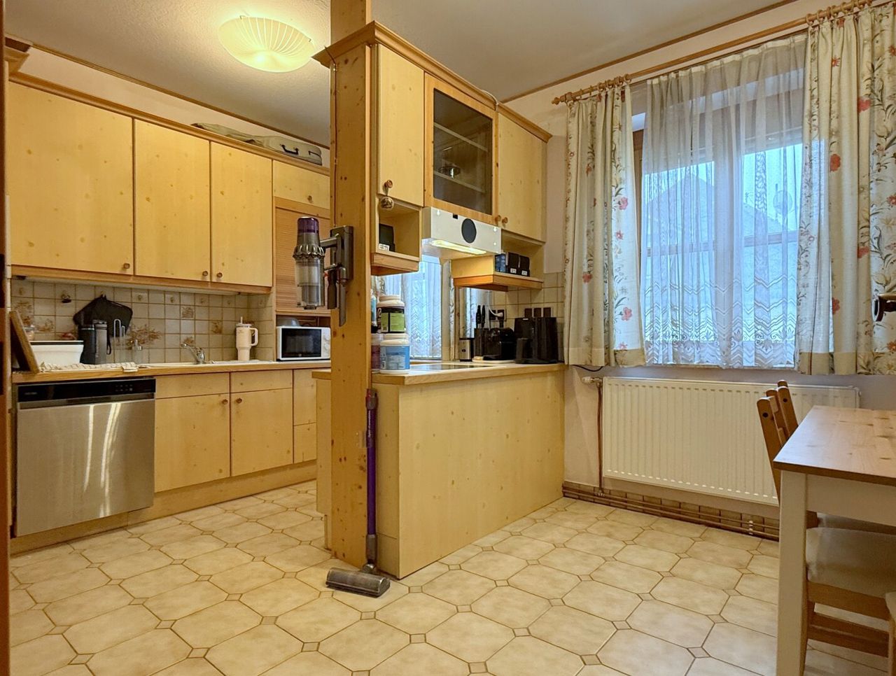 Rechts vom Wohnzimmer liegt die großzügige Küche. Klassisch gefliest, charmant altmodisch – aber mit genügend Platz für einen Frühstückstisch, schnelle Kaffeepausen oder ein spontanes Familienfrühstück. Hier spürt man sofort die gemütliche, bodenständige Atmosphäre der Achtzigerjahre, und man muss das nicht erklären – man fühlt es.