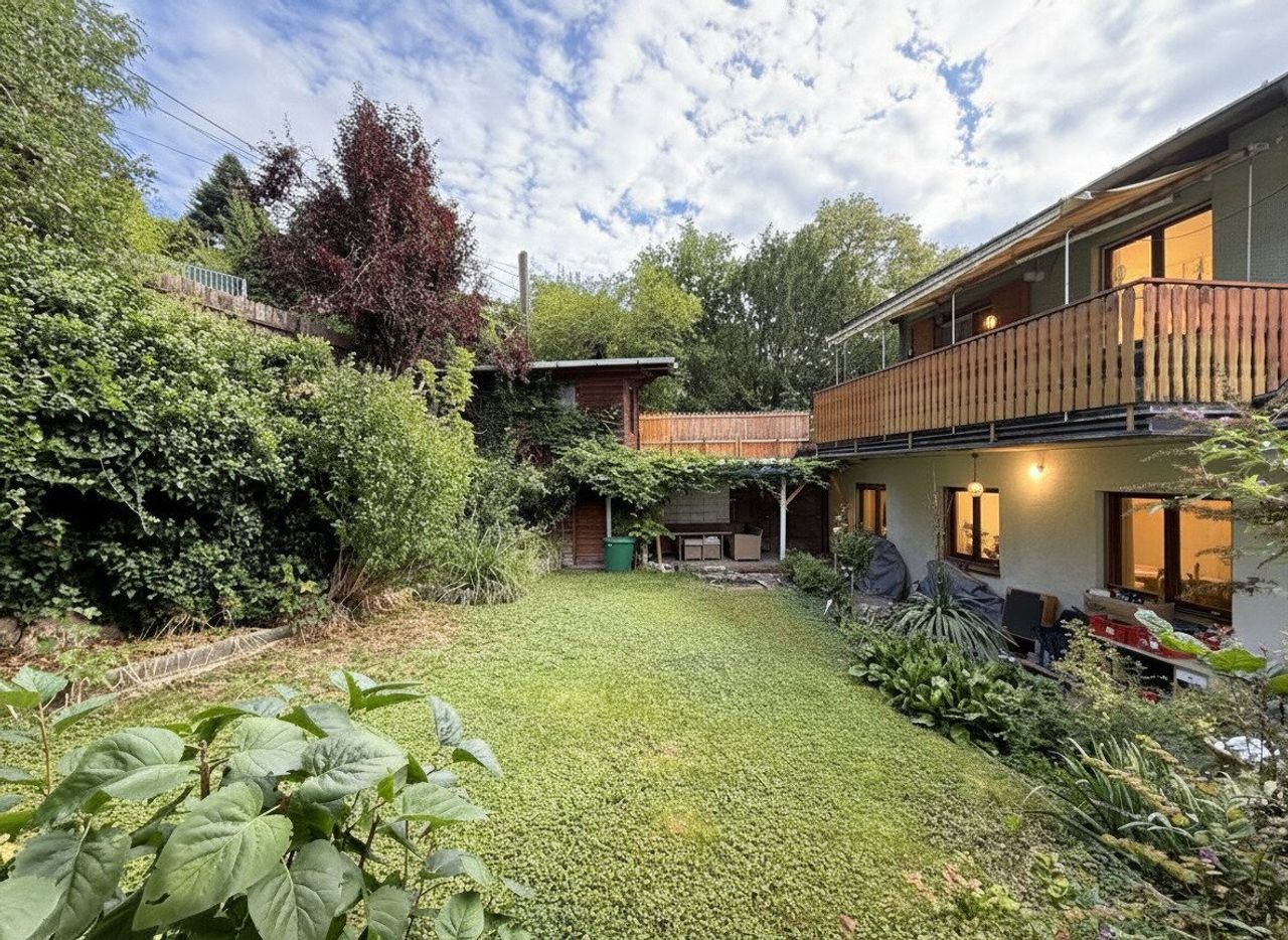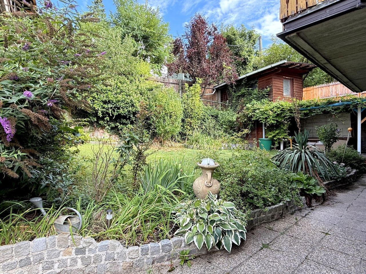 Zwei Garagen komplettieren das Ensemble: eine vorne an der Straße, eine hinten mit Zufahrt über die Hochstraße – fast wie zwei Eingänge in zwei Leben. Und irgendwo dazwischen: eine Laube, eingehüllt in ein Blättermeer, so still und hübsch, dass man sie fast erst auf den zweiten Blick wahrnimmt.