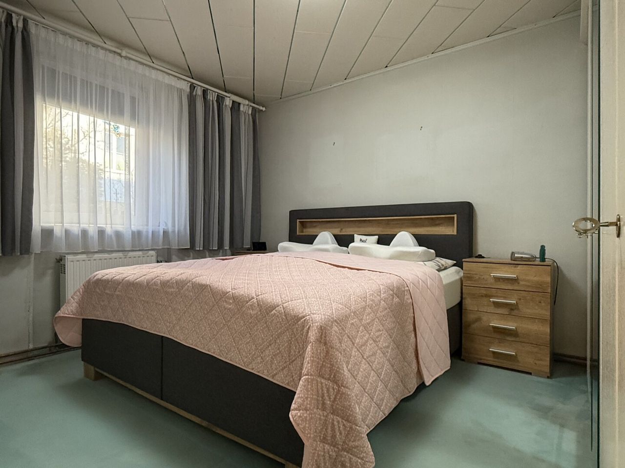 Ein kleines Schlafzimmer praktisch angelegt, angrenzend gleich der Wohnraum selbst eher langgestreckt, beides mit Blick in den Vorgarten und auf die Straße. Straße ist doch wohl etwas übertrieben, hier kommt nur sehr selten wer vorbei.