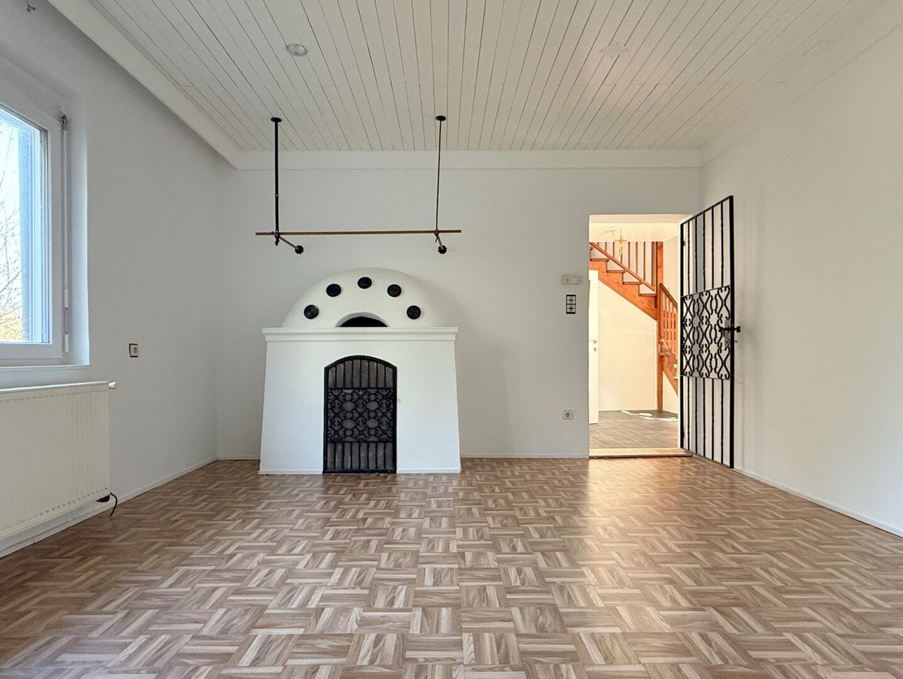 Geheizt wird mit einem Holzofen für die Übergangszeit – urig, gemütlich, effektiv. An kalten Wintertagen sprang früher eine Ölheizung mit 4.000-Liter-Tank ein, ob diese noch funktionsfähig ist, muss allerdings noch getestet werden. Aber auch ohne der wird’s warm und stimmungsvoll.