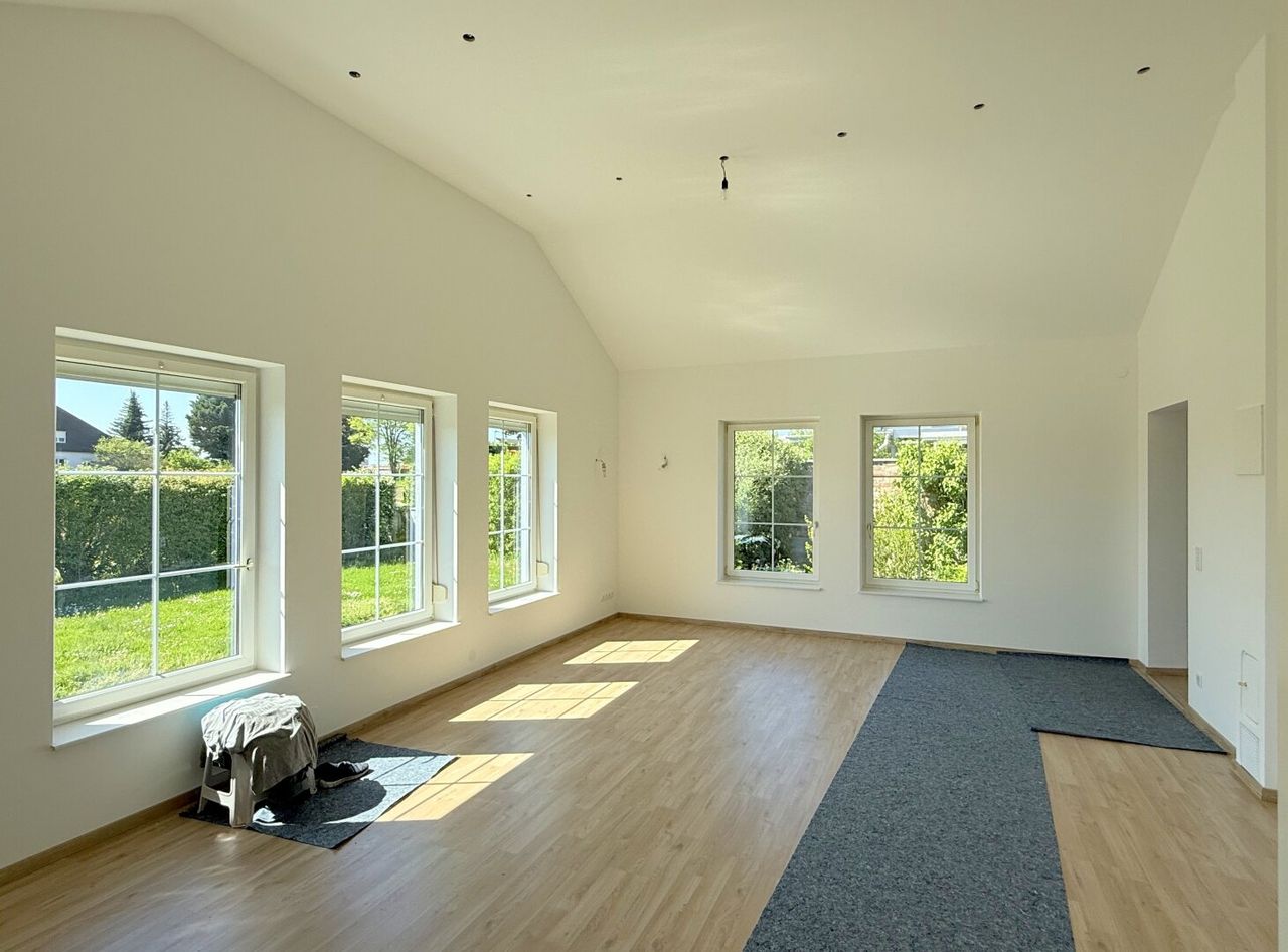 Der hohe Giebelraum lässt Licht und Raum verschmelzen und macht den Wohnbereich mit einem Hauch von Loft-Feeling zu einem ganz besonderen Erlebnis - unverwechselbar und selten zu finden. Die vielen Fensterflächen zeigen ausschließlich das Grün, welches fremde Einblicke erfolgreich abwehrt.