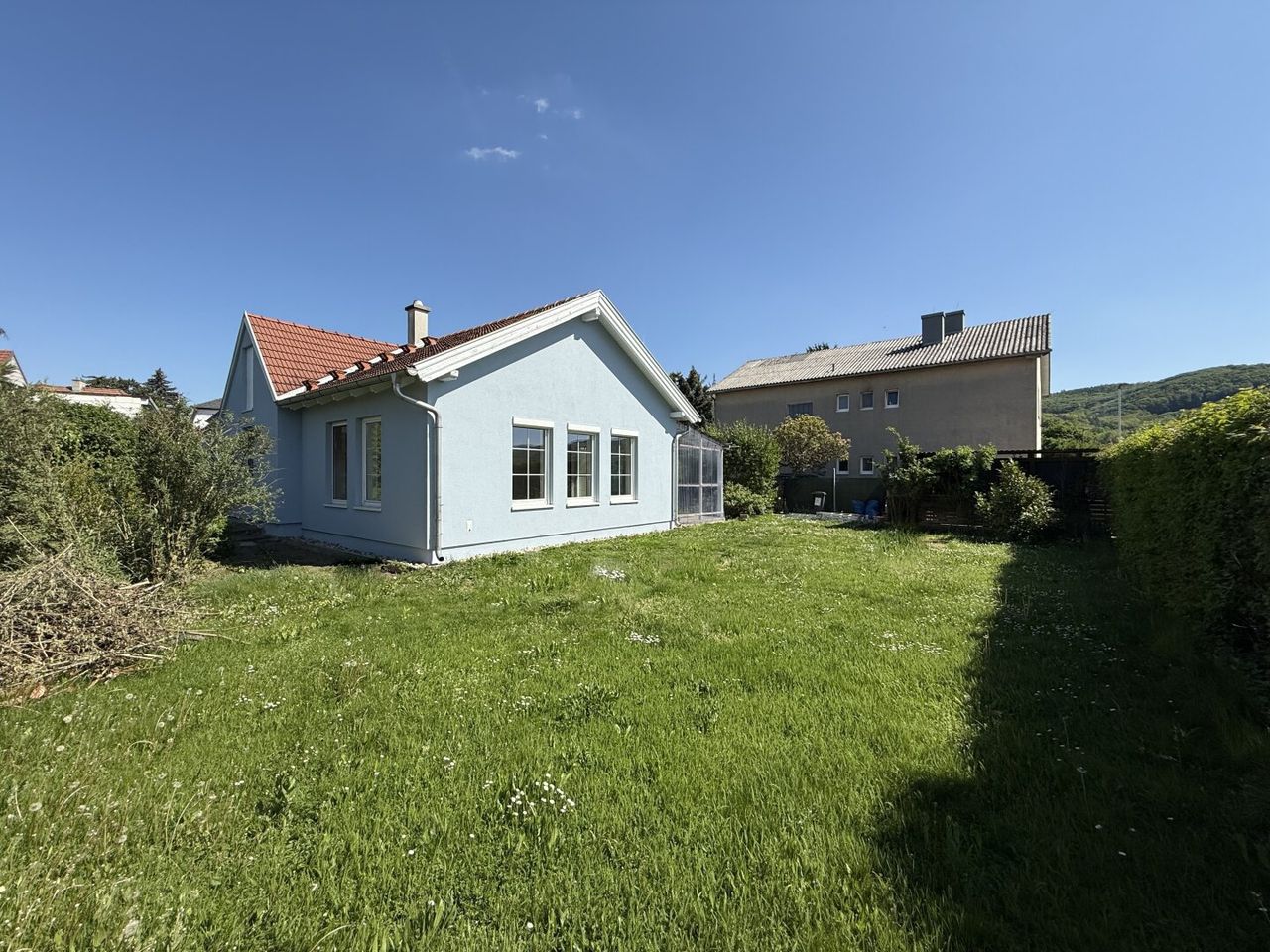 Das ursprünglich 1950 erbaute Haus wurde 1998 umgebaut und 2025 noch einmal von Grund auf saniert – mit spürbarer Sorgfalt und einem klaren Blick für Qualität. Außen präsentiert sich das Haus in einem fröhlichen Blau, das sofort ins Auge fällt, innen erwarten einen rund 85 m² voller Licht, Luft und Wohngefühl.