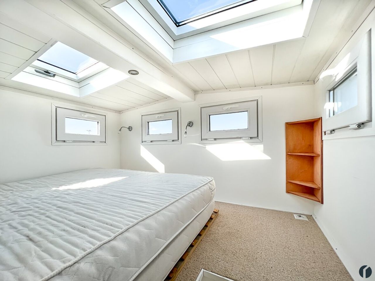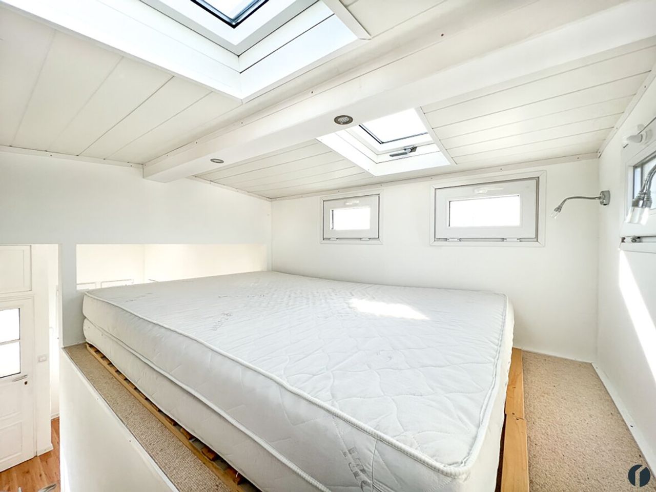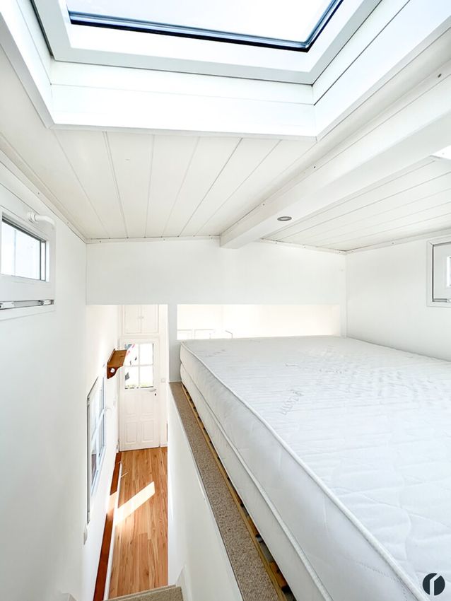 Über eine Treppe gelangen Sie in den oberen Schlafbereich, wo eine Doppelmatratze bequem Platz findet. Die großen Dachfenster ermöglichen es Ihnen bei schönem Wetter unter dem freien Sternenhimmel zu schlafen.
