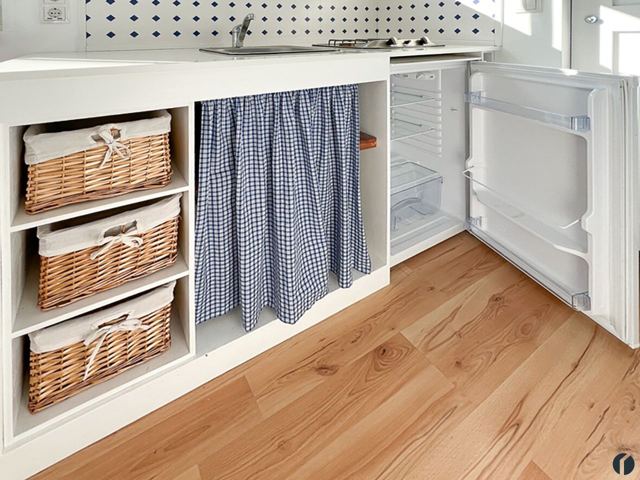 Alle technischen Notwendigkeiten wie eine kleine Küche mit Abwaschbecken und Kühlschrank sowie eine zweiflammigen Kochmöglichkeit, die mit Gasflaschen betrieben wird sowie Regale sind bereits eingebaut. Weiters wurde ein Badezimmer mit Schiebetür, einer Dusche, Waschbecken sowie ein WC installiert.