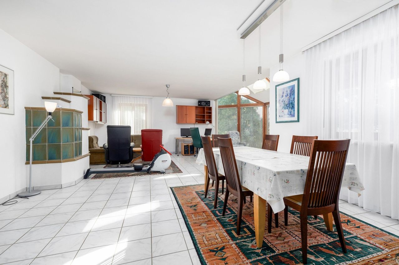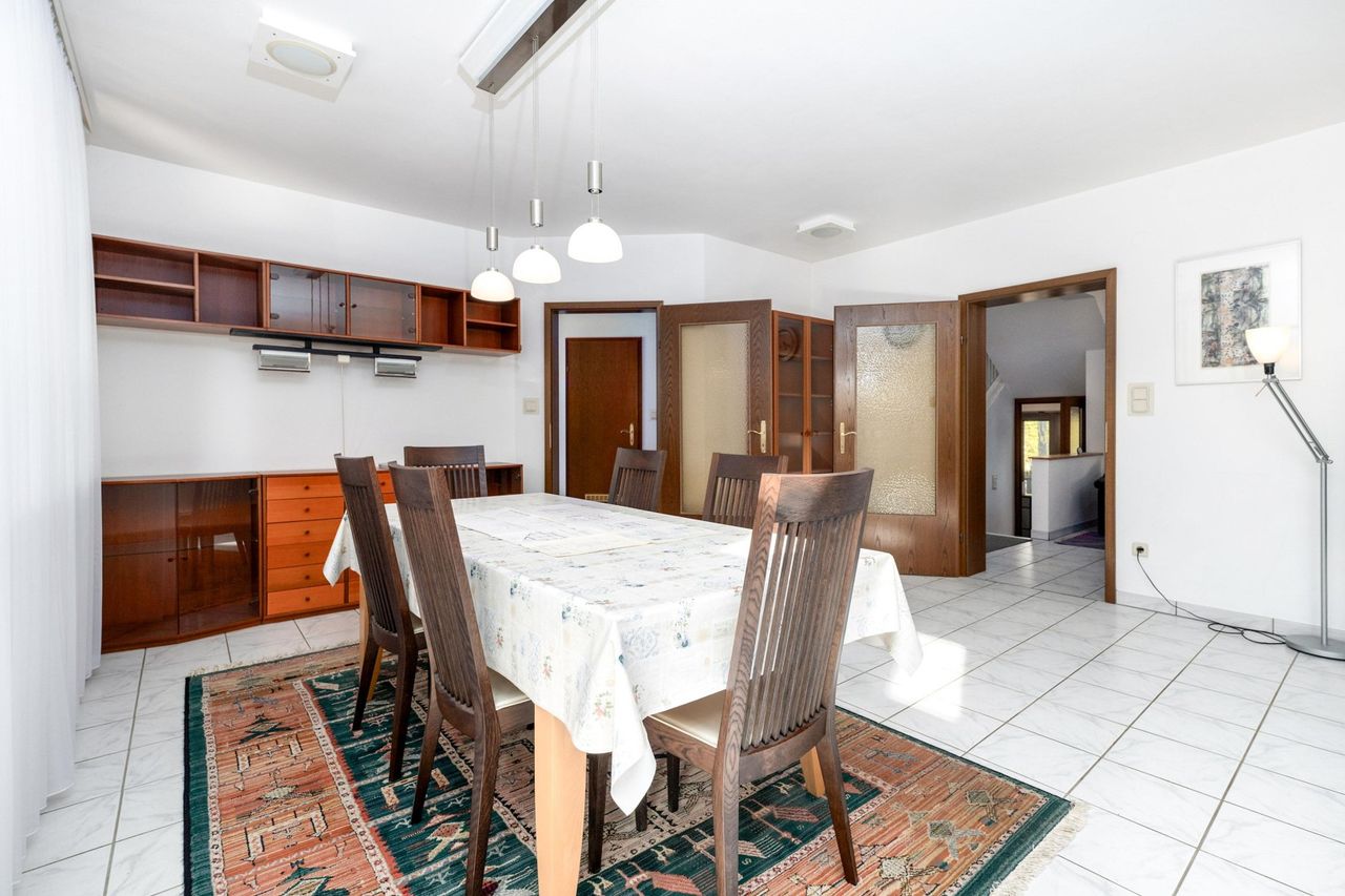 Das Herzstück des Hauses ist der weitläufige Wohn- und Essbereich, der durch die Zusammenlegung des Esszimmers entstanden ist. Große Fenster und der direkte Zugang zur Terrasse verbinden den Innenraum harmonisch mit dem Garten.