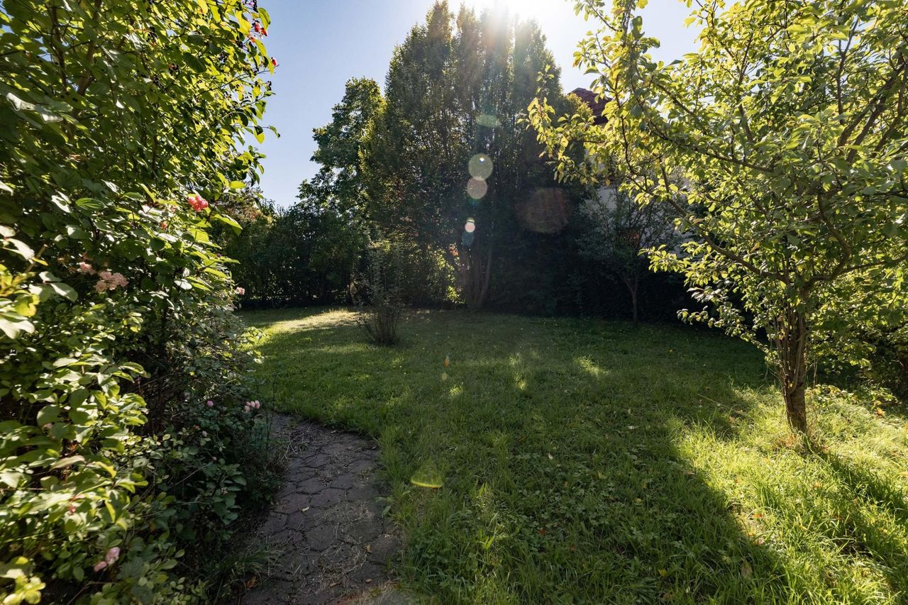 Das Grundstück verfügt über einen schönen Garten mit altem Baumbestand, Rasenflächen und viel Platz zum Spielen, Entspannen oder Gärtnern.