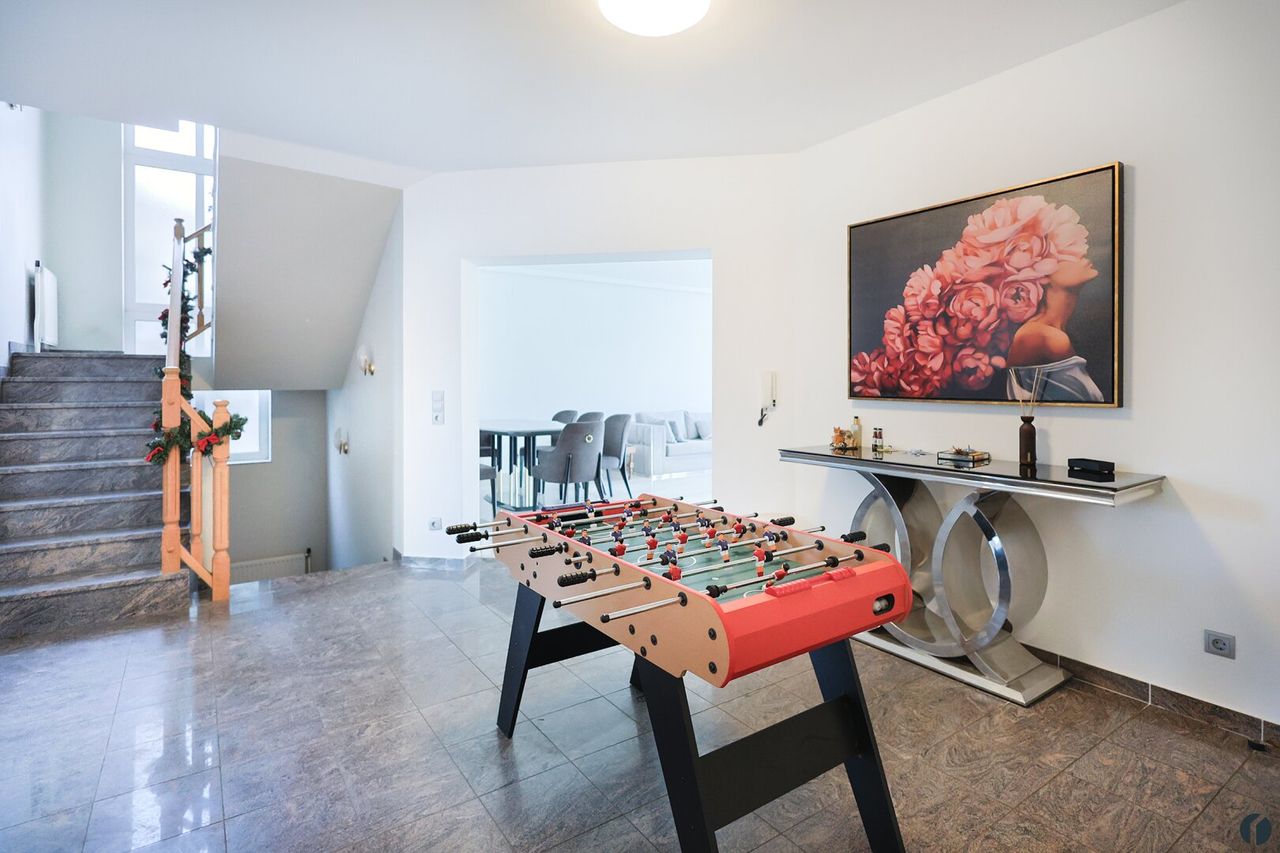 Vom Vorzimmer aus gelangt man zuerst in die anschließende zentrale Diele. Im Erdgeschoß finden Sie neben dem Vorzimmer eine helle Küche samt großem Essbereich sowie das sehr große Wohnzimmer, von wo aus Sie über die angrenzende Terrasse in den schön angelegten Garten mit Pool gelangen. Weiters befindet sich noch ein WC mit Waschbecken auf dieser Ebene.