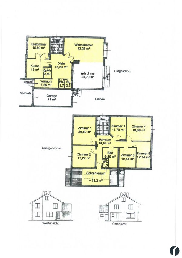 Im Obergeschoß sind ebenfalls alle Räume zentrale begehbar. Hier erwarten Sie 5 Zimmer sowie ein Schrankraum und das Bad, das mit Badewanne und Doppelwaschbecken ausgestattet ist. Außerdem steht Ihnen hier noch ein weiteres WC zur Verfügung.